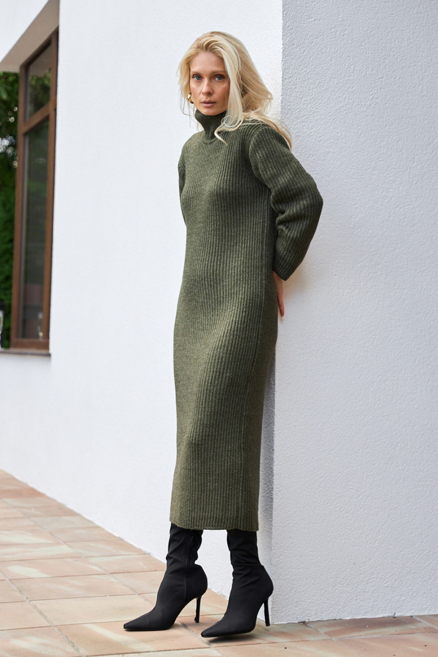 Comfortable long dress made of khaki-colored half-wool yarn, which will be appropriate in the cold season. A loose silhouette model with an elegant collar-clamp, a lowered shoulder line. The body-pleasing dense knit holds its shape well. The dress will add femininity and sophistication to the image.