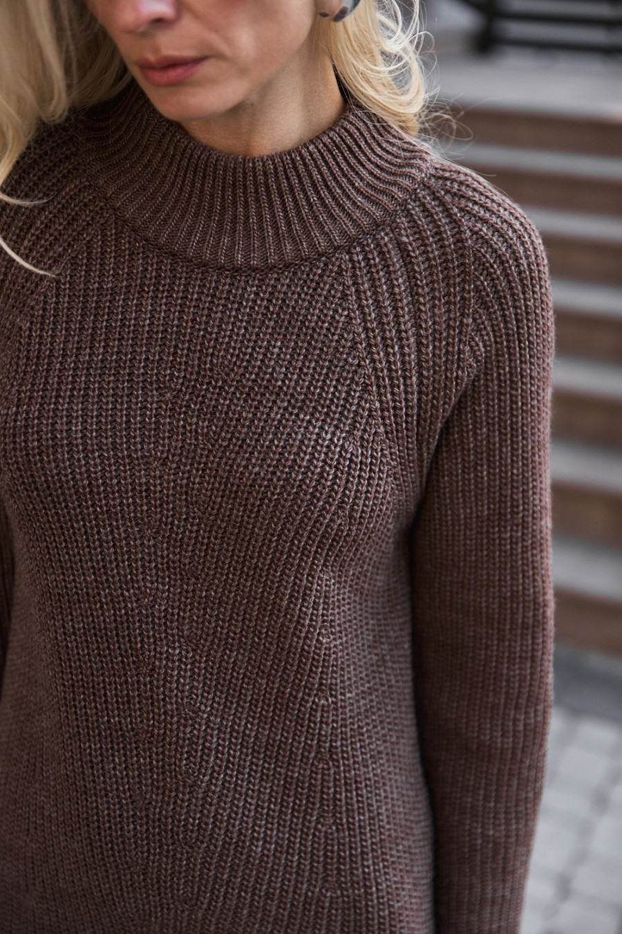Elegant bronze-colored dress made of semi-woolen yarn with a dense, stable weave, which is a cozy and practical option for the cool season. A loose silhouette model with a stand-up collar that gently hugs the neck. A minimalist ornament on the front of the dress, which gives the product sophistication and emphasizes restrained elegance.