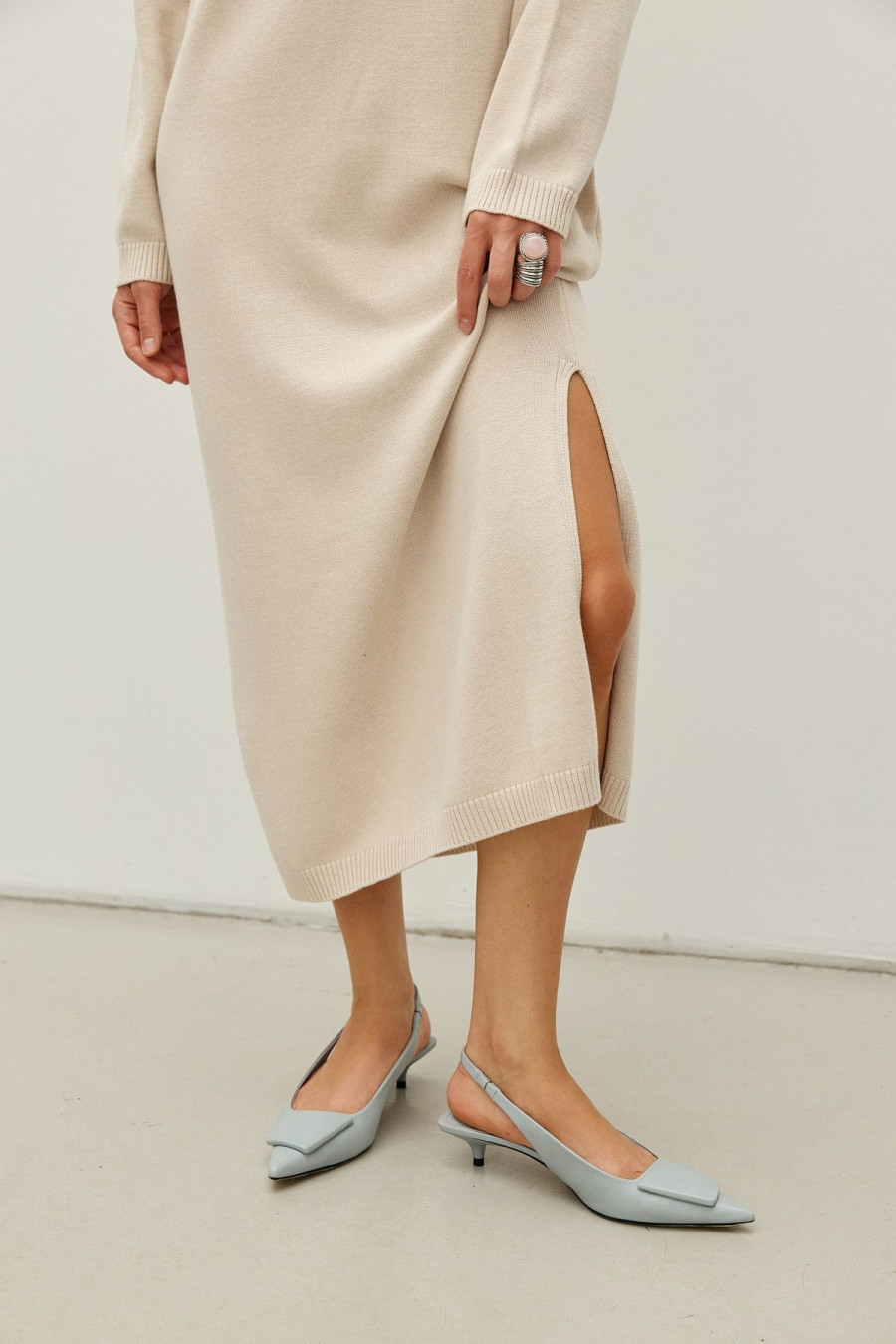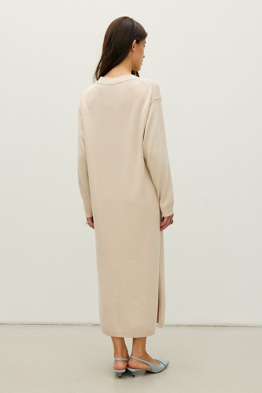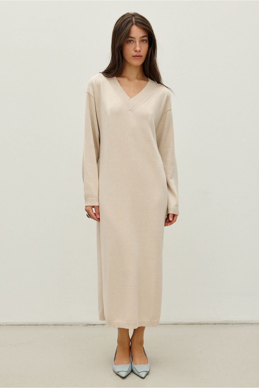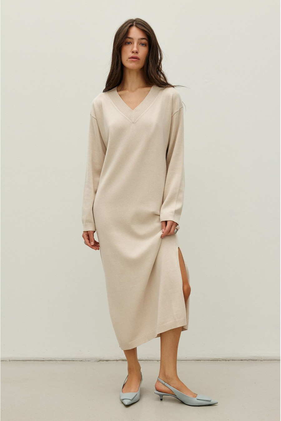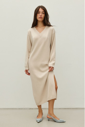 Beige-flesh knitted midi demi-season dress made of natural cotton yarn that is pleasant to the body, which will add tenderness and romance to the image. The model of a straight silhouette is slightly narrowed to the bottom with a wide V-shaped neckline with an elastic band, a dropped shoulder line, long spacious sleeves with elastic cuffs and a cuff at the hem, deep slits in the side seams. The dress will add mystery and charm to the image, emphasize the fragility and slimness of the forms. The outfit will complement a fashionable wardrobe, give a feeling of comfort and freedom of movement.