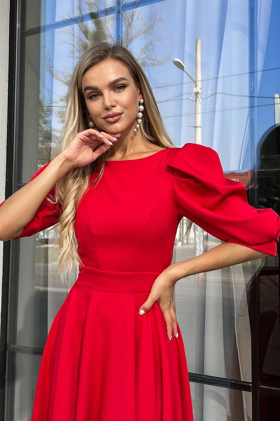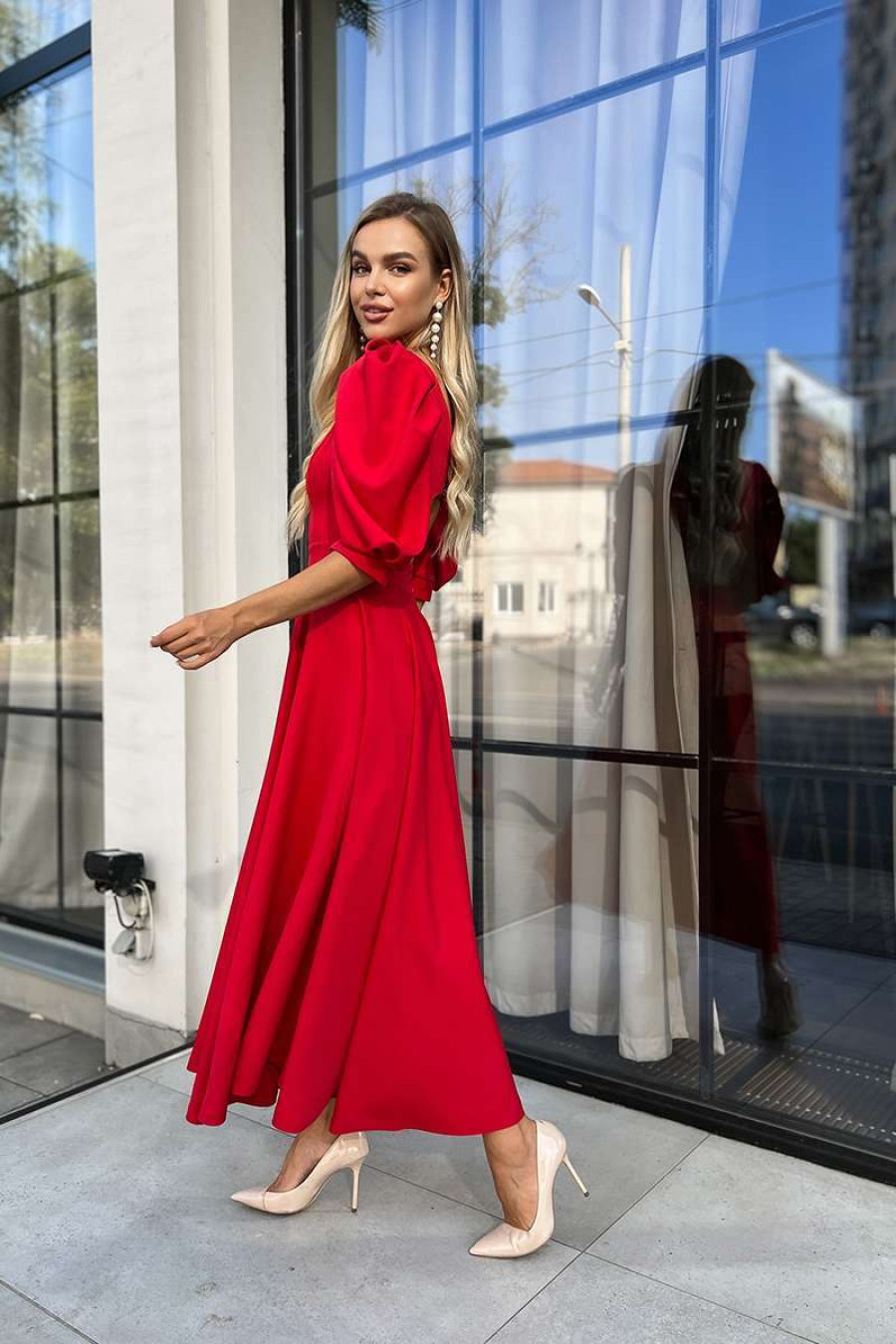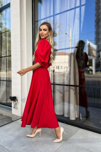An exquisite red-garnet long dress with an open back made of dense inelastic suit fabric. A semi-fitted silhouette model with a wide neckline, a back cutout with button fasteners, spacious 3/4 lantern sleeves with sewn-in cuffs, figured seam reliefs, a lush cut-out skirt with a hidden zipper on the back. The dress will emphasize the fragility and grace of the figure, add lightness and charm to the image. The outfit will be a good option for a prom dress and goes well with both discreet classic accessories and bright jewelry.