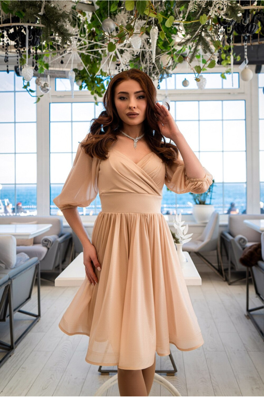 An exquisite short prom dress made of light chiffon with a golden-beige coating that will add mystery and charm to your look. A semi-fitted model with a deep V-neckline, 3/4 flared sleeves with sewn-in elastic at the shoulders and cuffs, a wide sewn-in belt with elastic, a detachable fluffy skirt, a hidden zipper on the back, and a knitted lining. The dress will add romance to your girlish look, emphasize the slimness and femininity of your silhouette. The outfit will successfully complement your festive wardrobe and will be appropriate for any celebrations.