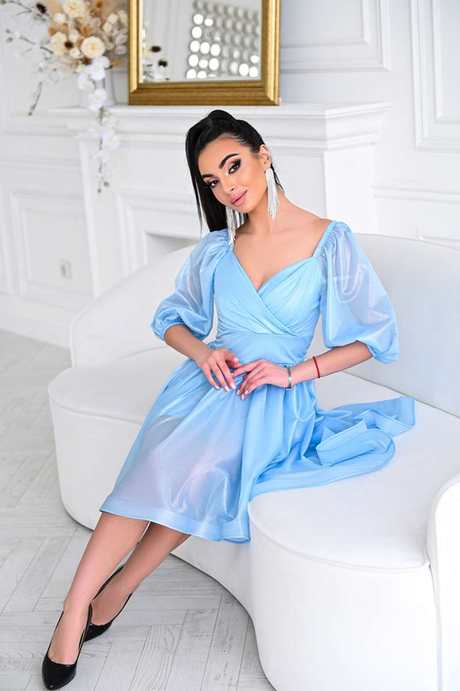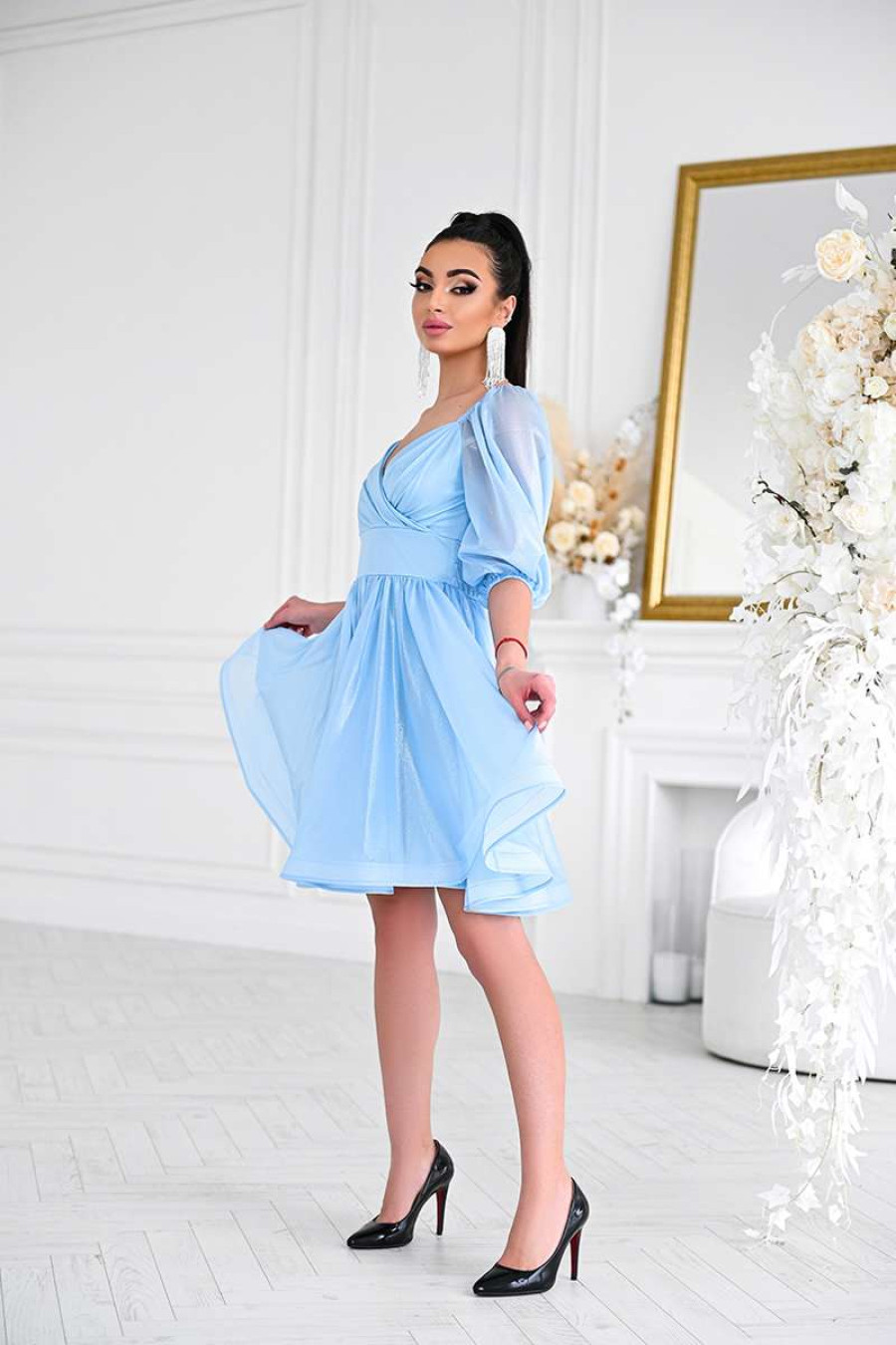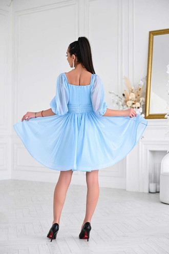 Playful airy short prom dress made of light chiffon with a sky-blue spray. Semi-fitted model with a deep figure-hugging neckline, 3/4 lantern sleeves with sewn-in elastic at the shoulders and cuffs, a wide sewn-in belt with elastic, a detachable fluffy skirt, a hidden zipper on the back, a knitted lining. The dress will add romance to the girlish image, emphasize the slimness and femininity of the silhouette. The outfit will successfully complement the festive wardrobe and will be appropriate for any celebrations.