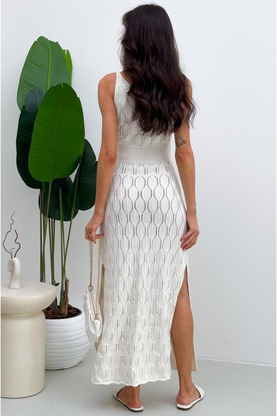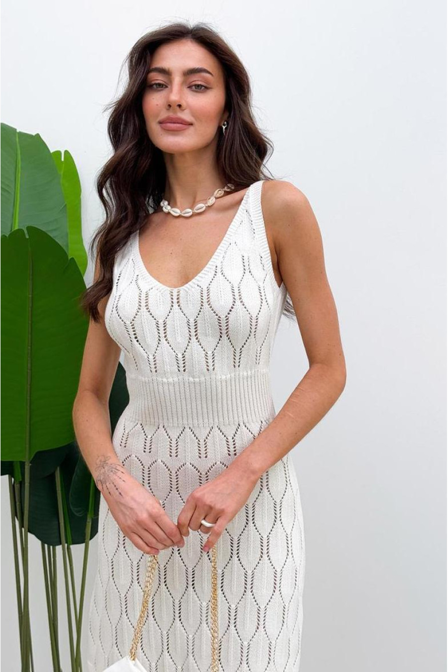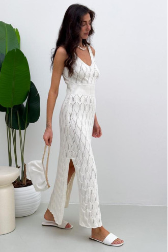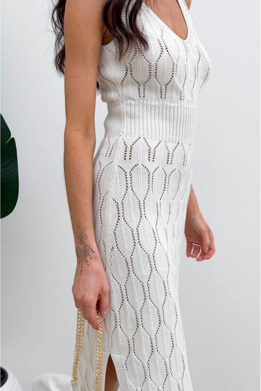 Stylish summer dress created for elegant and delicate looks of the warm season. Made of openwork knitted fabric, which looks light and airy. The model has a deep rounded neckline and a fitted cut, which is formed by the built-in knitted elastic at the waist. There are deep cuts on both sides, the edges of which are neatly decorated with elastic knitted elastic. The dress looks delicate and expressive at the same time, ideal for sunny days and light summer looks.