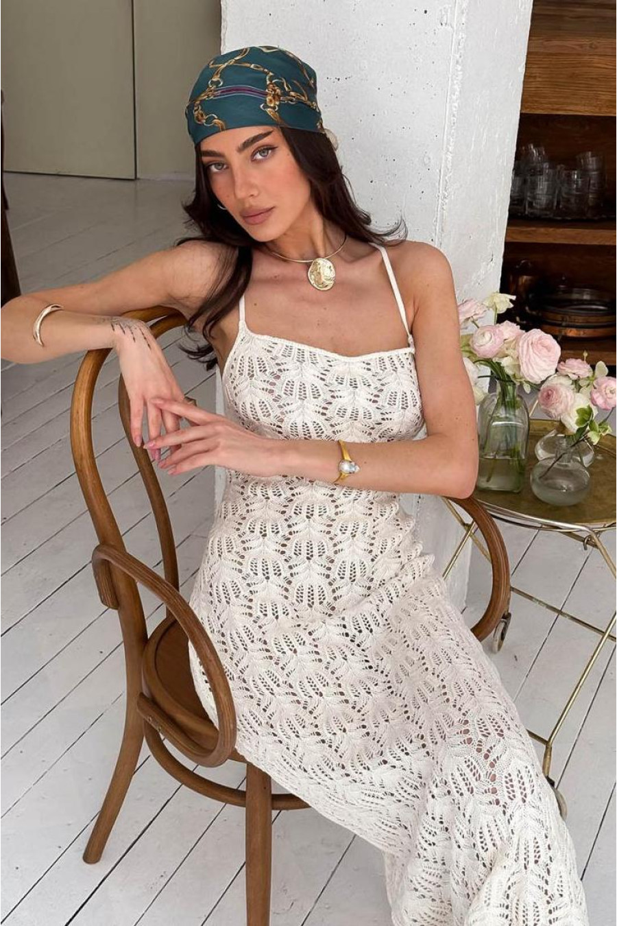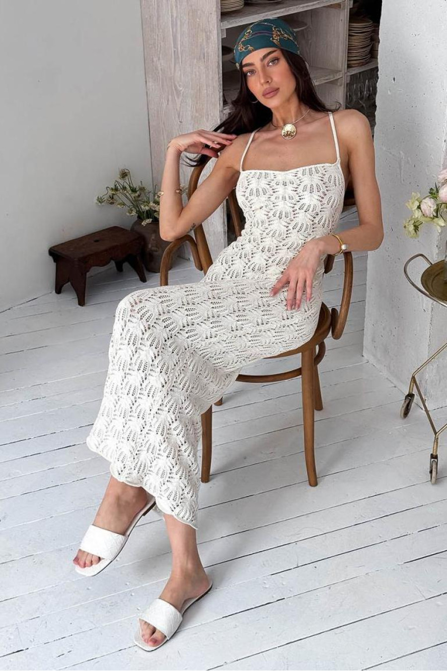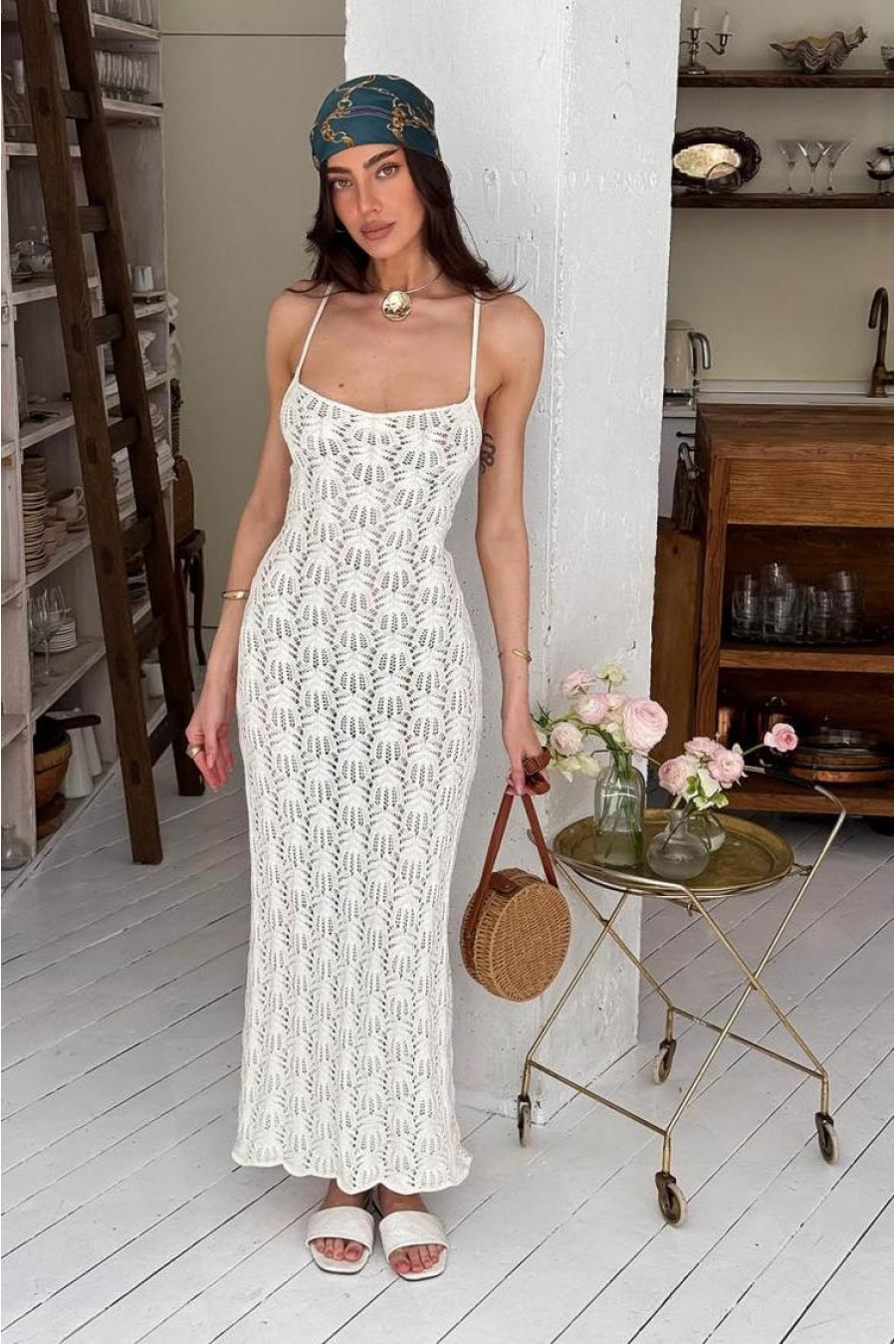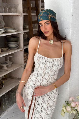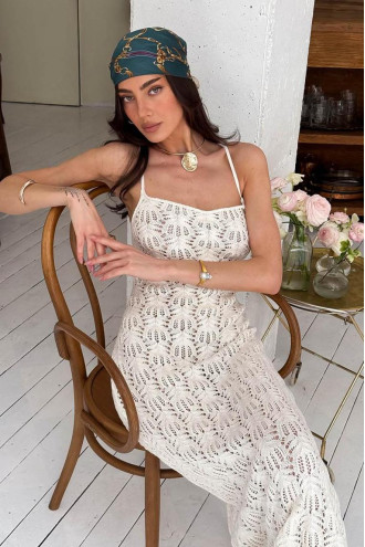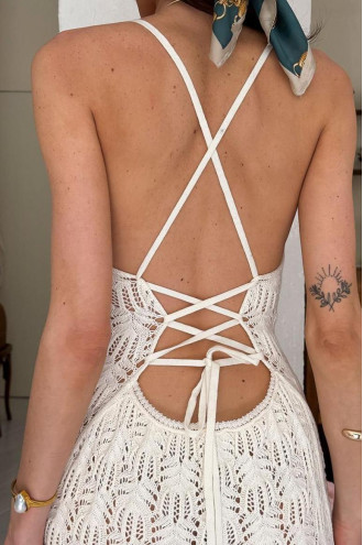 A light and elegant long dress creates a feminine and delicate look, combining the aesthetics of minimalism and romantic details. The model is made of thin knit on straps and is complemented by a beige lining. A special accent is the open back with corset-style ties, which allows you to adjust the fit and makes the look more interesting. The dress sits beautifully on the figure, repeating the silhouette and providing comfort due to the elasticity of the material. Perfect for both a beach look and a more romantic mood.
