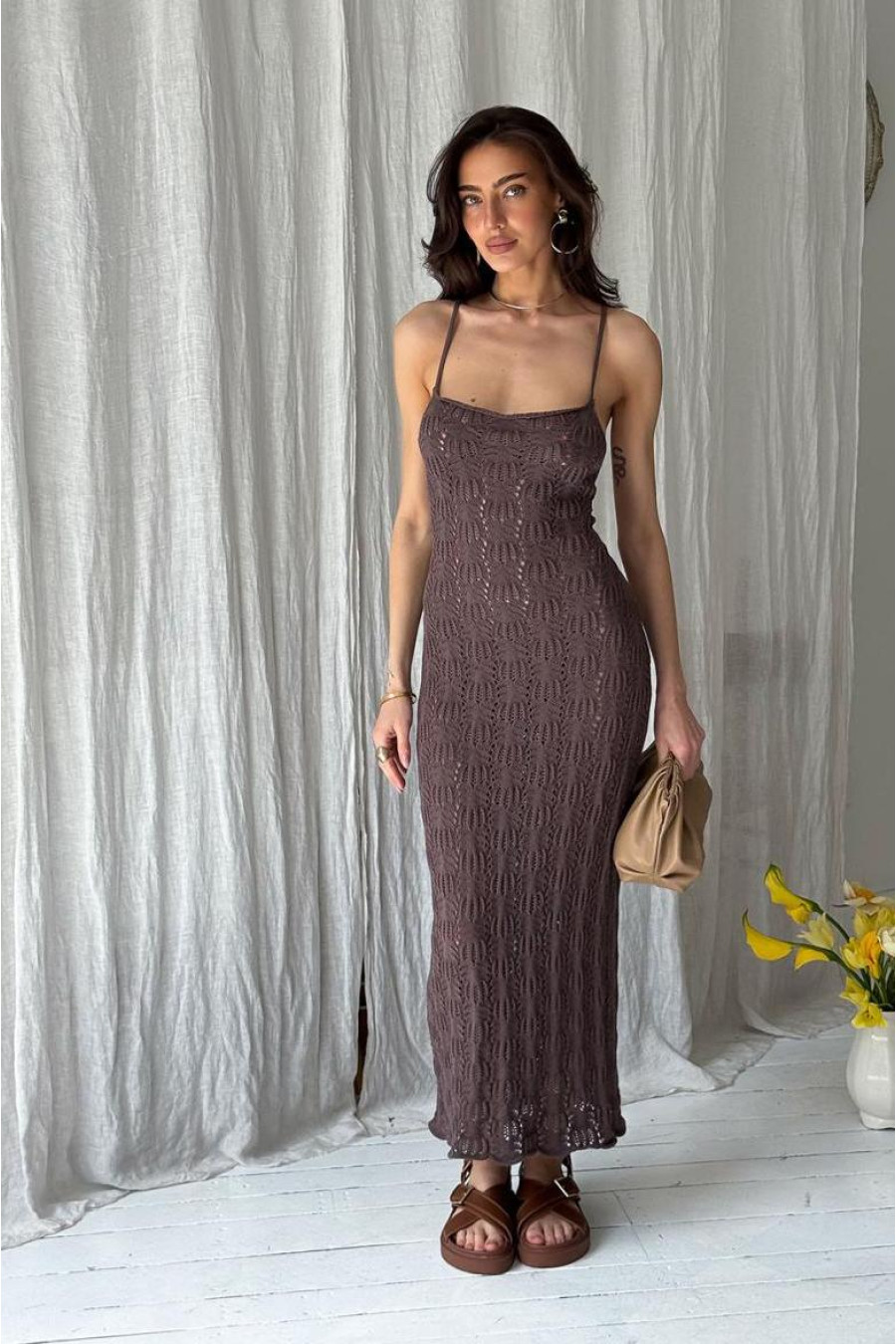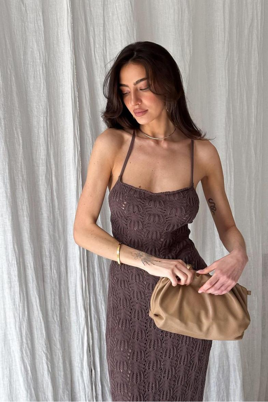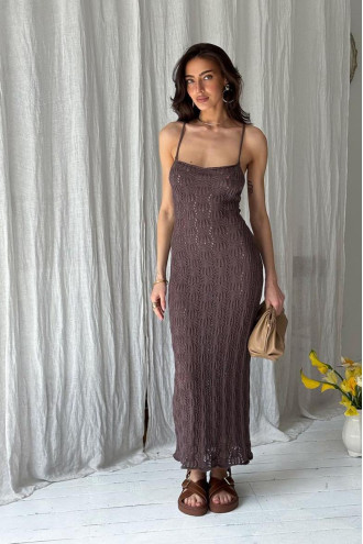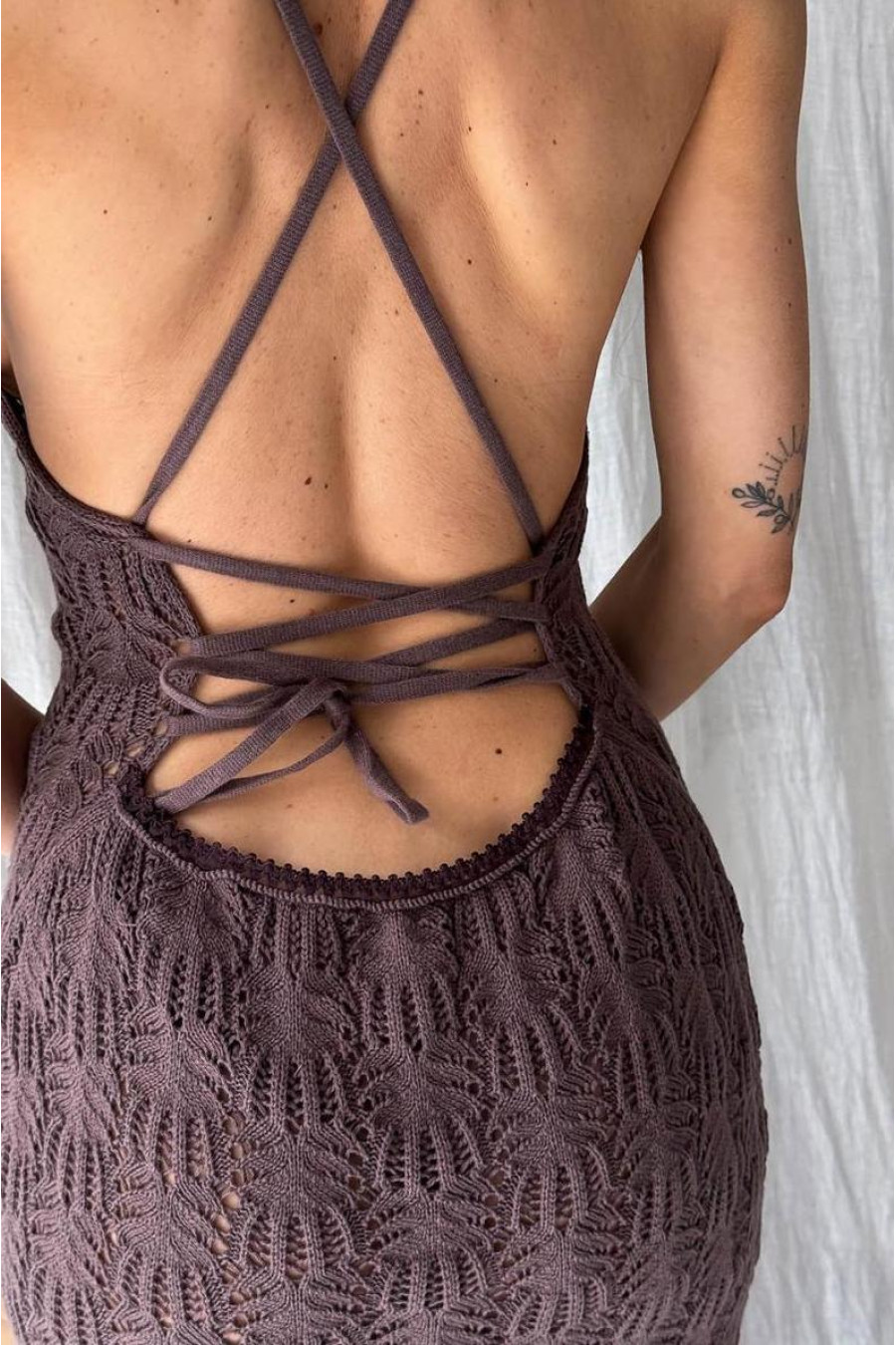 A light and elegant long dress creates a feminine and delicate look, combining the aesthetics of minimalism and romantic details. The model is made of thin knit on straps and is complemented by a beige lining. A special accent is the open back with corset-style ties, which allows you to adjust the fit and makes the look more interesting. The dress sits beautifully on the figure, repeating the silhouette and providing comfort due to the elasticity of the material. Perfect for both a beach look and a more romantic mood.