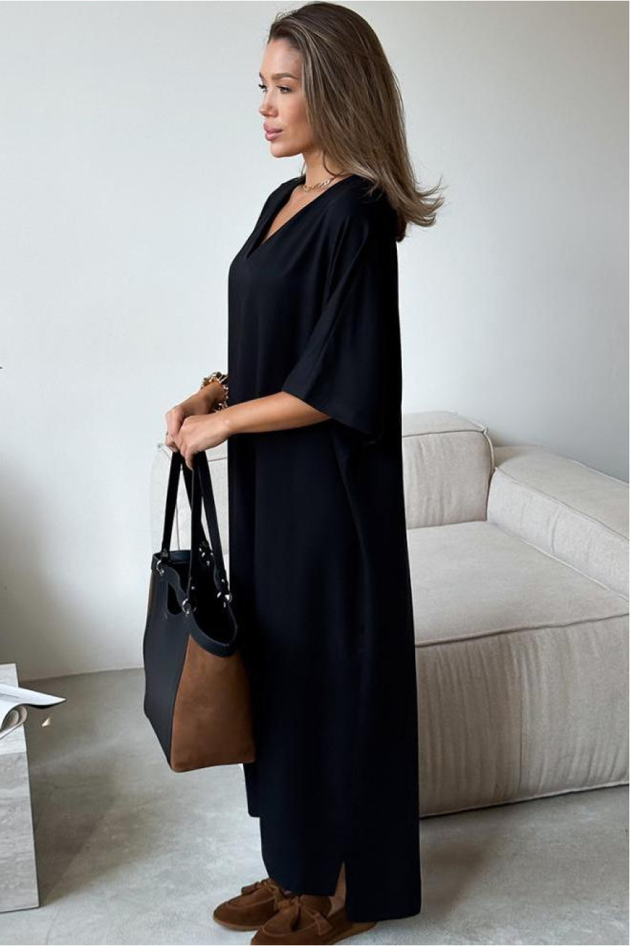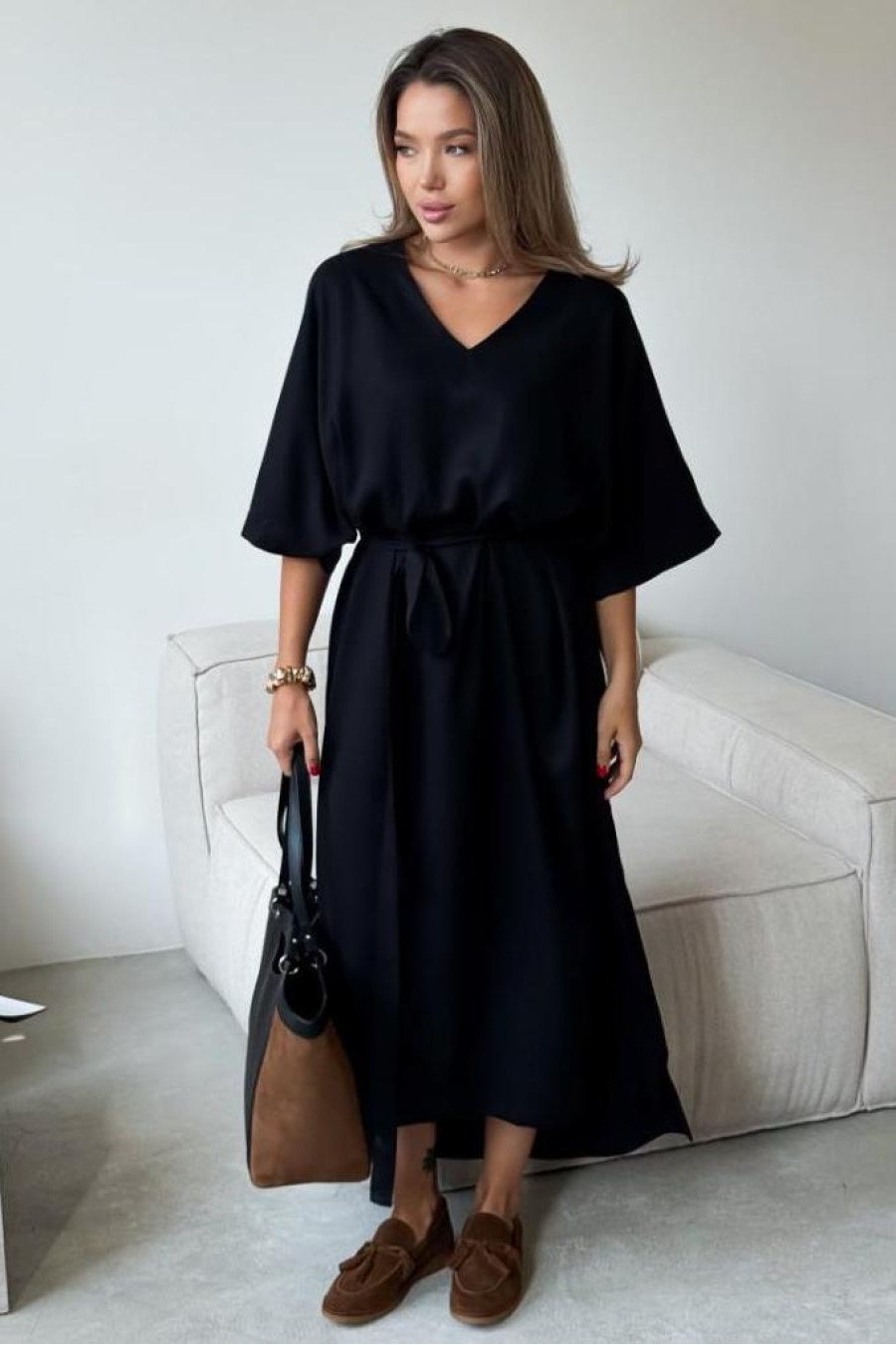 Dresses made of eucalyptus fiber are a great choice due to the combination of naturalness, high hygroscopicity and pleasant to the touch texture. The model has a free silhouette that creates a relaxed and modern look. The loose sleeves add lightness and comfort in movement, emphasizing the relaxed style of the product. The length of the model is asymmetrical, which gives the dress dynamics and visual lightness. The set includes a belt that can emphasize the waist. Such a dress can be combined with sneakers or sandals for every day, or with heeled sandals for a more festive look.