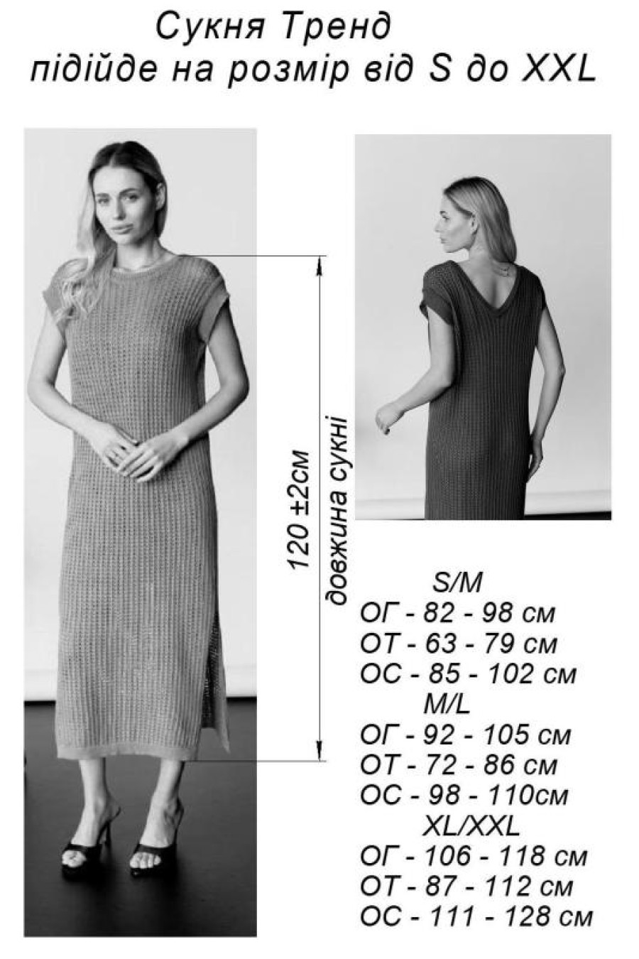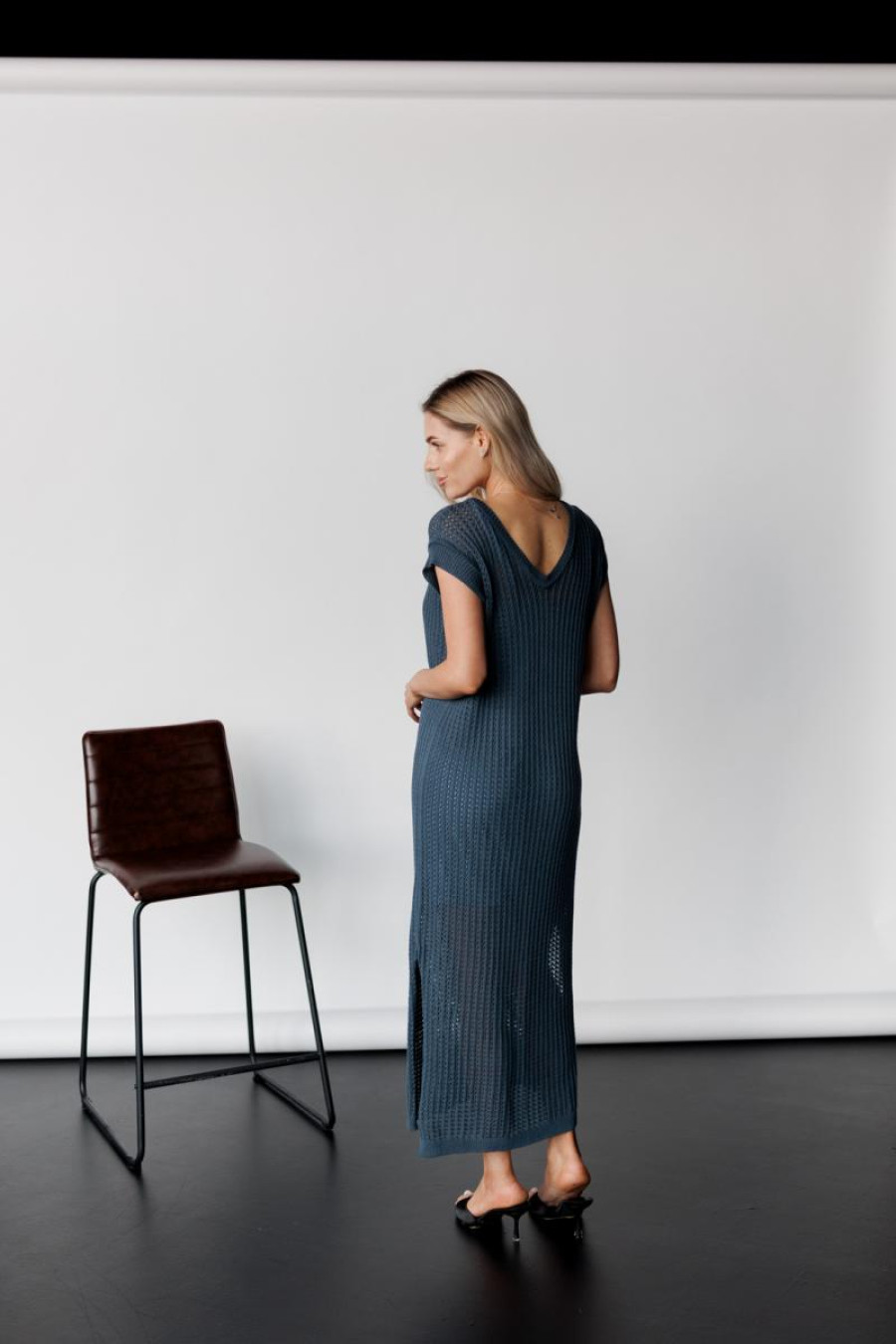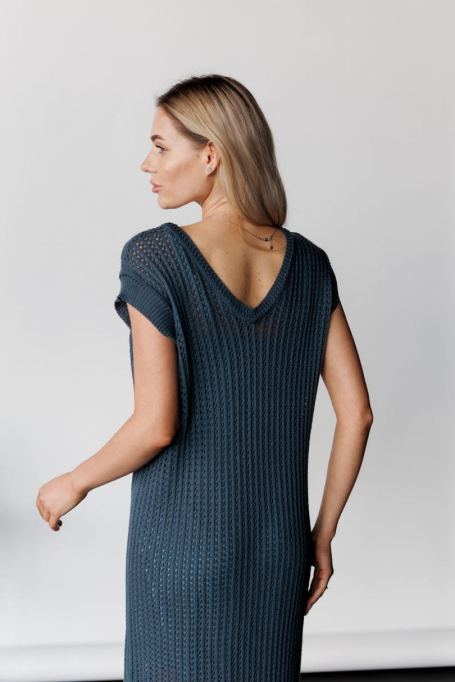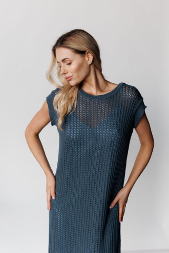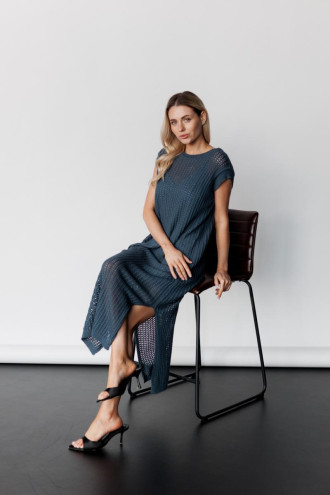 Knitted midi-length dress with an expressive textured mesh that adds depth and visual volume. The model has a straight, loose silhouette with short sleeves and an accent cut on the side, which makes the model more elegant and visually lengthens the legs. It has a round neckline in the front and a V-neckline on the back, which makes the model more interesting and feminine. The lining in tone with the dress on the straps provides comfort and adds lightness and a neat look to the image. The elastic knit provides comfort in wearing and beautifully fits the figure, making the dress suitable for both everyday looks and more elegant outings.