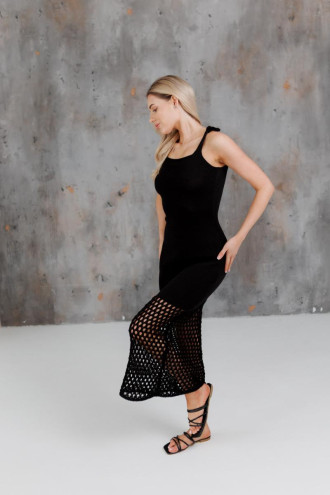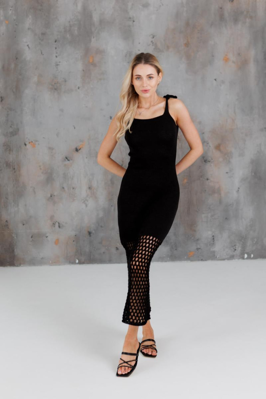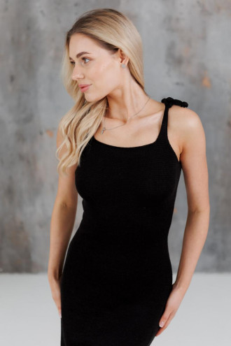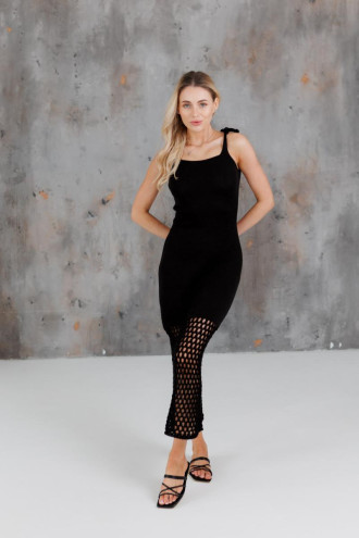 Long knitted dress with a soft, fitted silhouette that delicately flares out to the bottom, forming a trapeze. The model is made on a lining, which ensures comfort in wearing and holds its shape well, maintaining a neat look. The asymmetrical design with a tie on one shoulder creates a stylish accent and adds a modern character. The textured knit emphasizes the coziness of the product, combining comfort and elegance in one look.