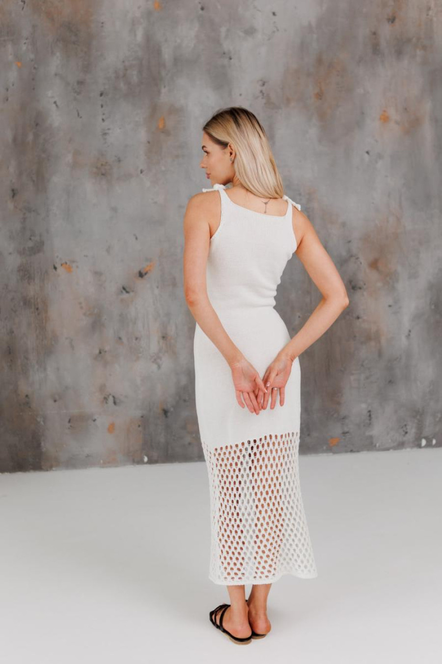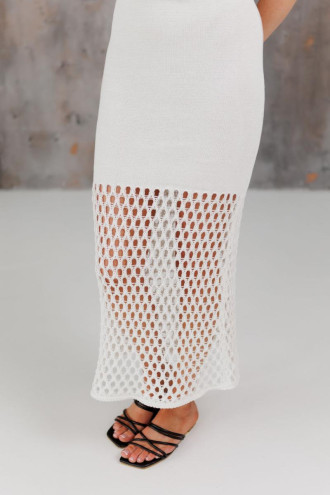Long knitted dress with a soft, fitted silhouette that delicately flares out to the bottom, forming a trapeze. The model is made on a lining, which ensures comfort in wearing and holds its shape well, maintaining a neat look. The asymmetrical design with a tie on one shoulder creates a stylish accent and adds a modern character. The textured knit emphasizes the coziness of the product, combining comfort and elegance in one look.