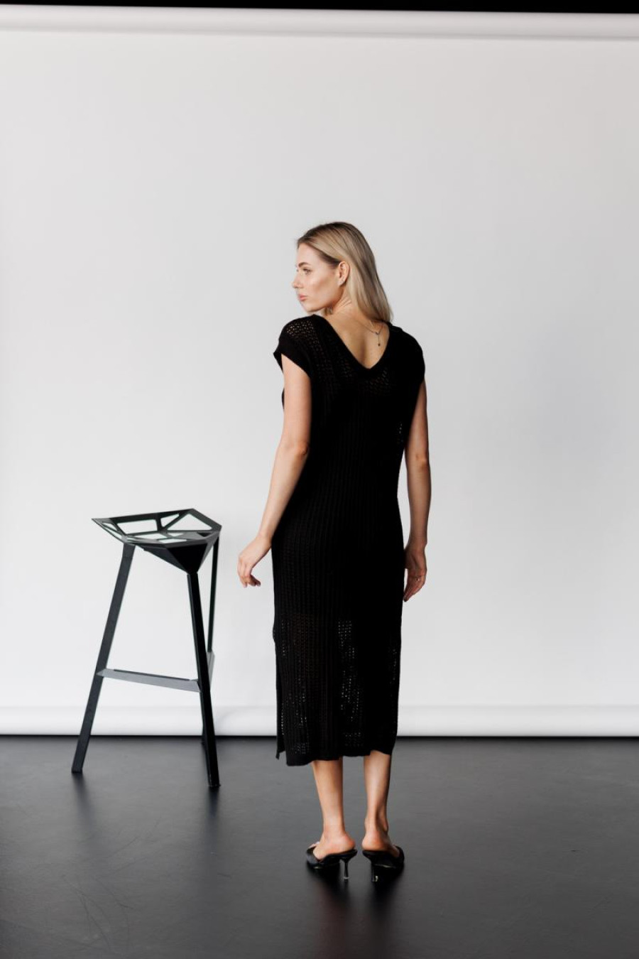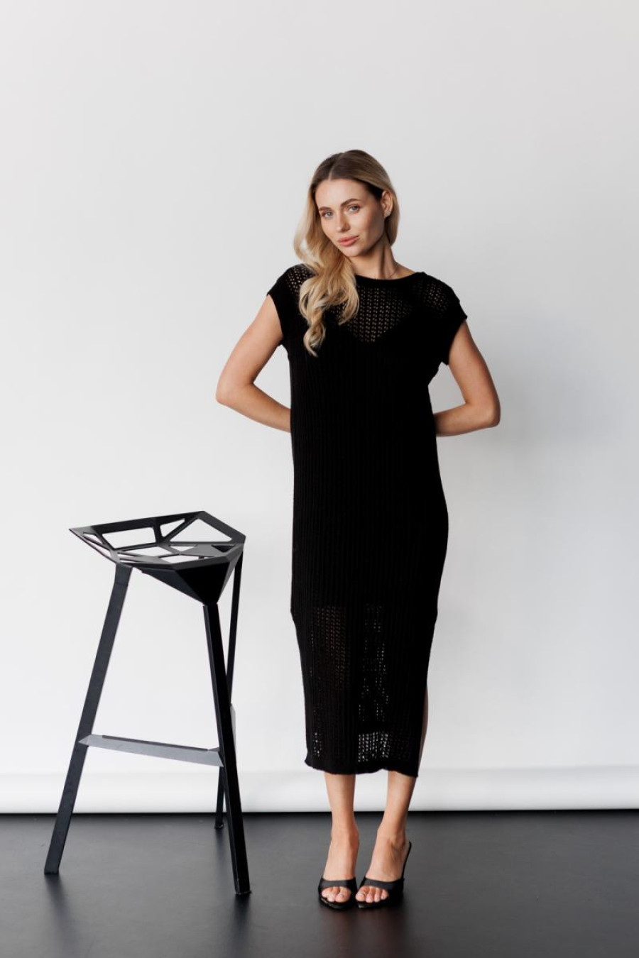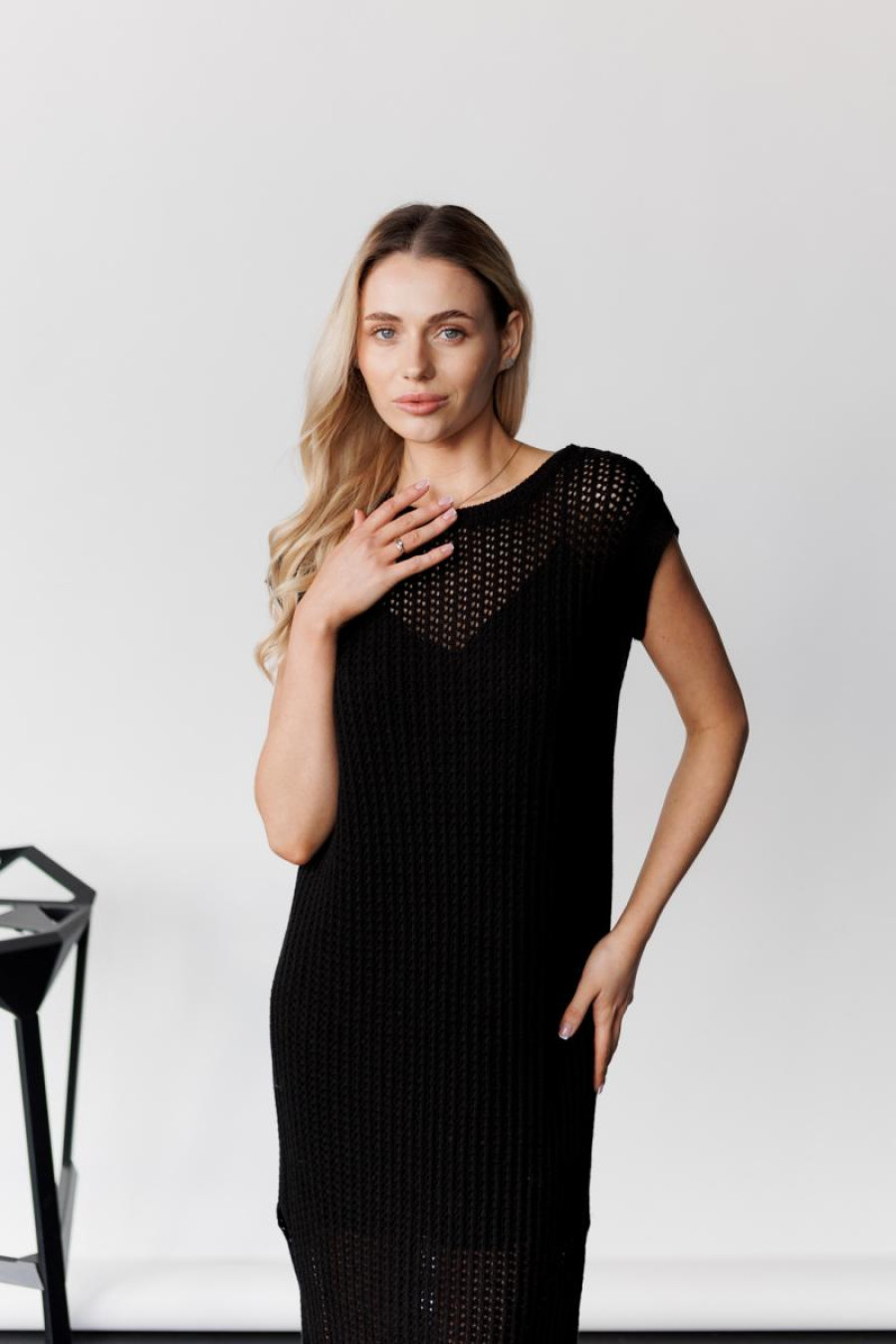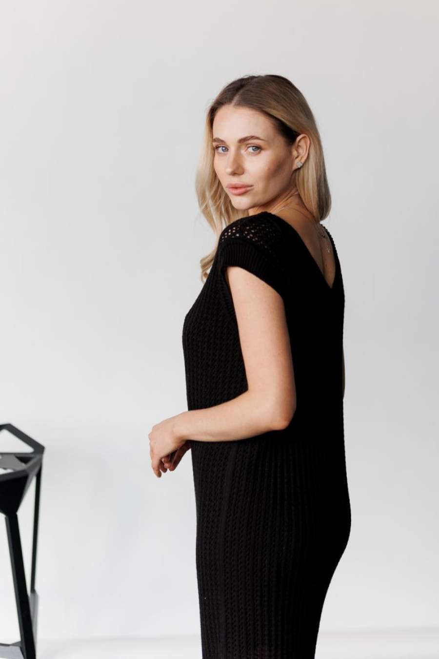 Knitted midi-length dress with an expressive textured mesh that adds depth and visual volume. The model has a straight, loose silhouette with short sleeves and an accent cut on the side, which makes the model more elegant and visually lengthens the legs. It has a round neckline in the front and a V-neckline on the back, which makes the model more interesting and feminine. The lining in tone with the dress on the straps provides comfort and adds lightness and a neat look to the image. The elastic knit provides comfort in wearing and beautifully fits the figure, making the dress suitable for both everyday looks and more elegant outings.