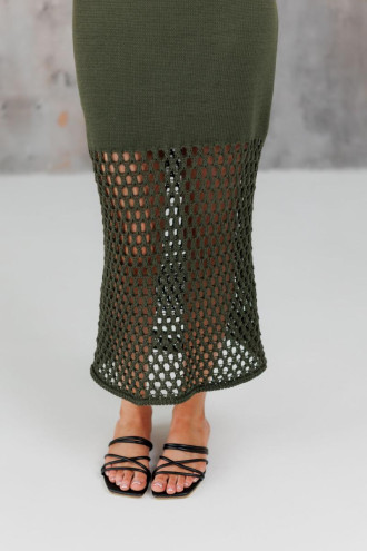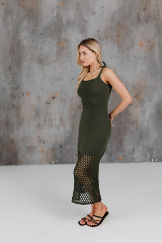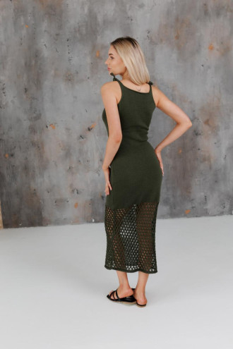 Long knitted dress with a soft, fitted silhouette that delicately flares out to the bottom, forming a trapeze. The model is made on a lining, which ensures comfort in wearing and holds its shape well, maintaining a neat look. The asymmetrical design with a tie on one shoulder creates a stylish accent and adds a modern character. The textured knit emphasizes the coziness of the product, combining comfort and elegance in one look.