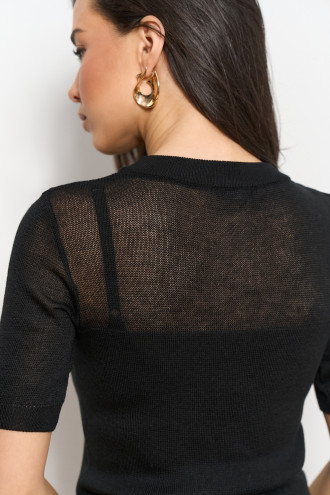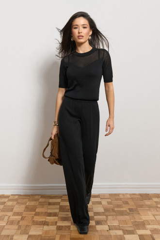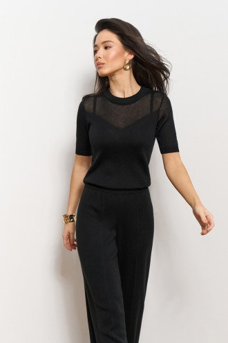Light, elegant and at the same time versatile - this T-shirt will become the basis for many stylish looks. Made of translucent fabric in a smooth weave. The accent of the product is a veiled neckline in the shape of a triangle. The model has a classic round neck trimmed with elastic, which harmoniously completes the neckline. The tight-fitting cut beautifully repeats the shapes, and the soft material provides comfort throughout the day.