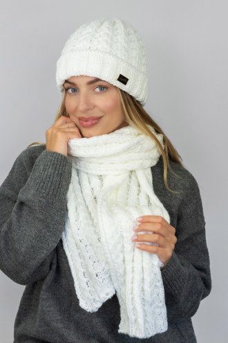 Stylish knitted set in white from mixed yarn with an expressive three-dimensional pattern, will give comfort and warm in the most severe frosts. The model consists of a hat and a scarf of coarse knitting that creates a modern accent. The set will complement the demi-season and winter wardrobe and goes well with various styles of outerwear.