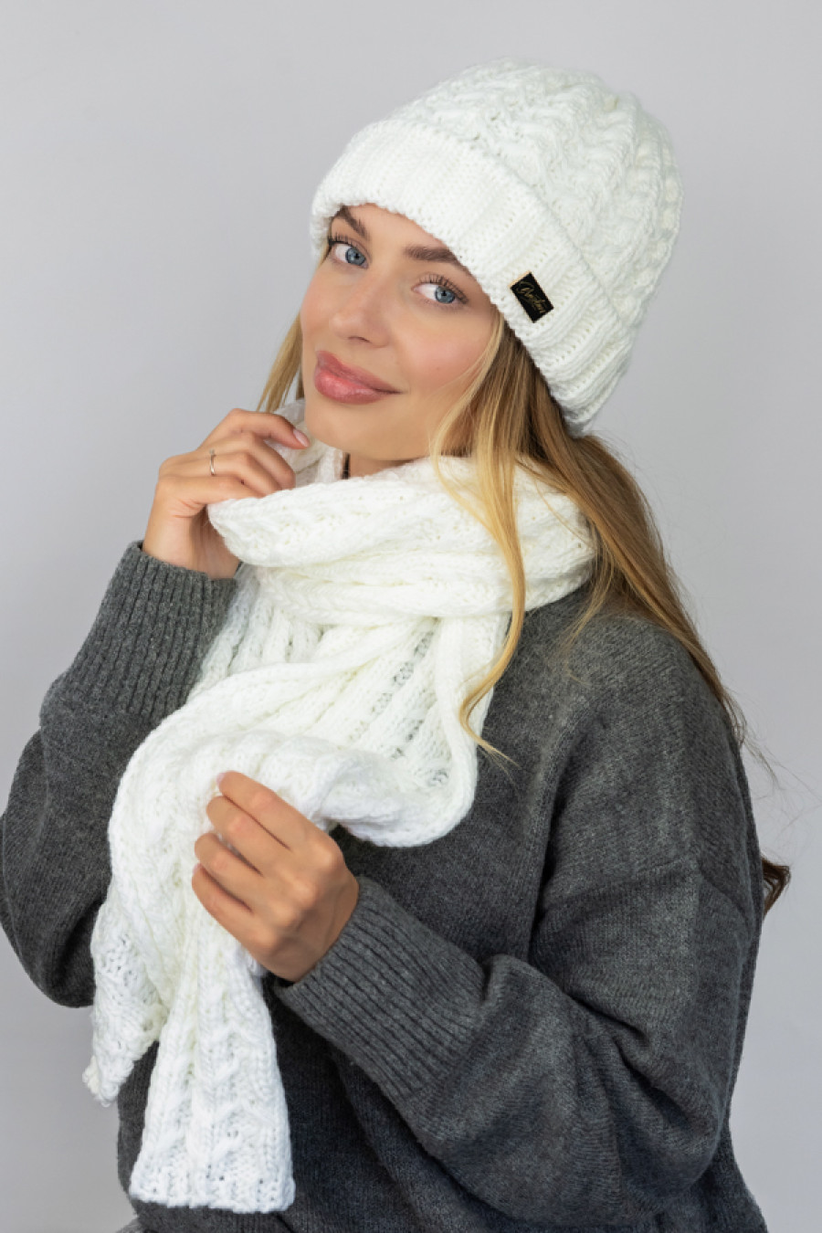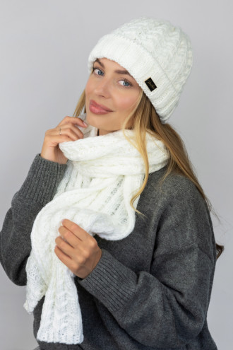 Stylish knitted set in white from mixed yarn with an expressive three-dimensional pattern, will give comfort and warm in the most severe frosts. The model consists of a hat and a scarf of coarse knitting that creates a modern accent. The set will complement the demi-season and winter wardrobe and goes well with various styles of outerwear.