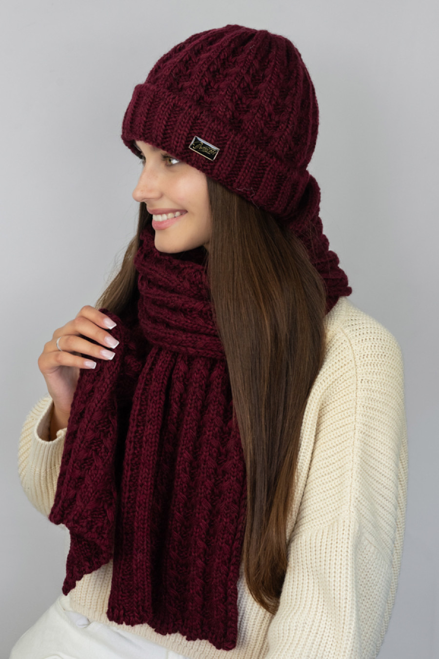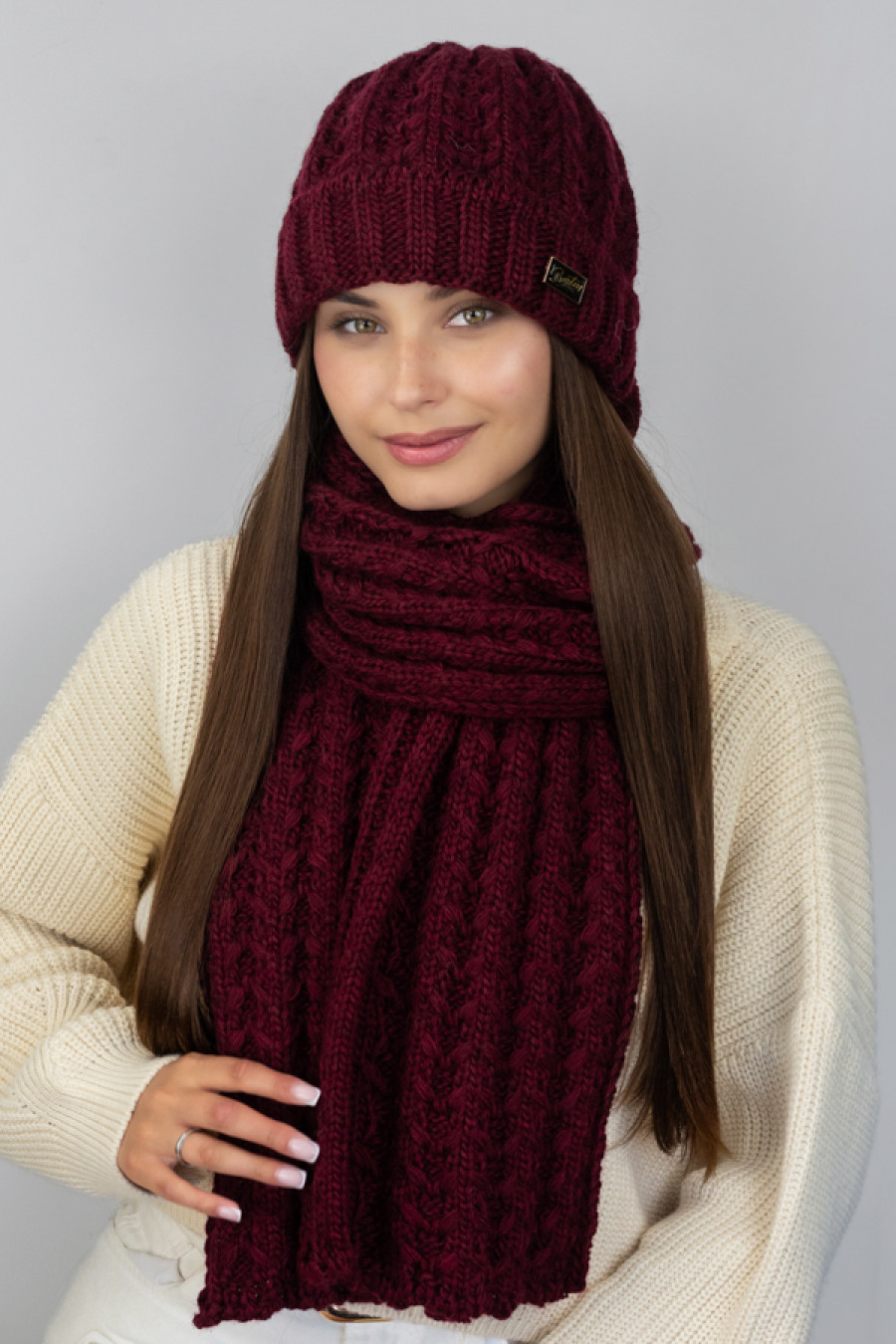 Burgundy-wine winter knitted women's set made of pleasant to the touch mixed acrylic yarn with a voluminous braid pattern, which will add juicy colors to the image. The model consists of a cap-cap with a wide lapel, microfleece lining, branded decor and a long wide scarf, which will warm the neck in the cold season. The set will complement the demi-season and winter girls' wardrobe, goes well with various styles of outerwear.