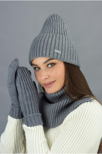 Knitted women's warm set made of mixed acrylic yarn in meringue-graphite color with a voluminous elastic pattern. The model consists of a single-layered bucket hat with a wide lapel, branded decor, a cozy snood-buff with a figured hem and high mittens with an elastic lapel. The set will give a feeling of comfortable warmth in the cold season, emphasize the femininity of the image. It goes well with various outerwear options from your wardrobe.