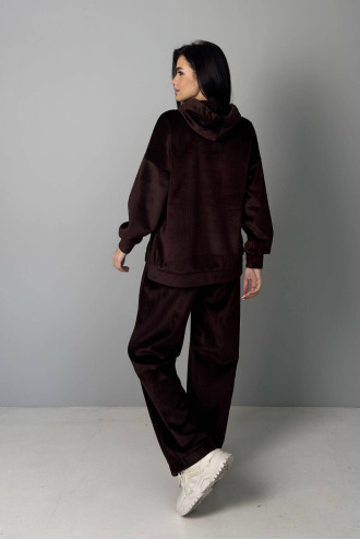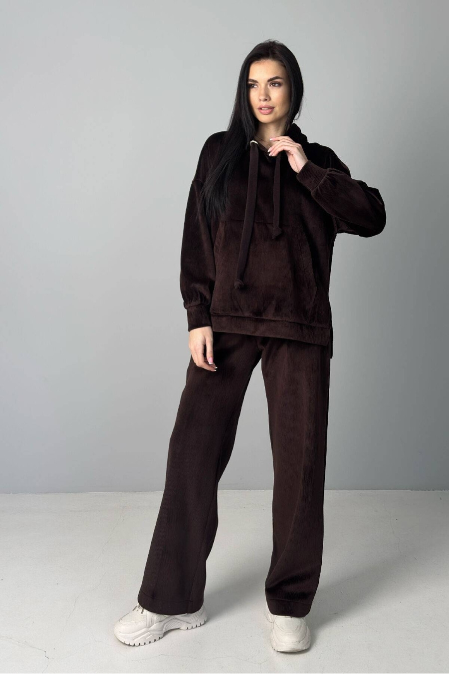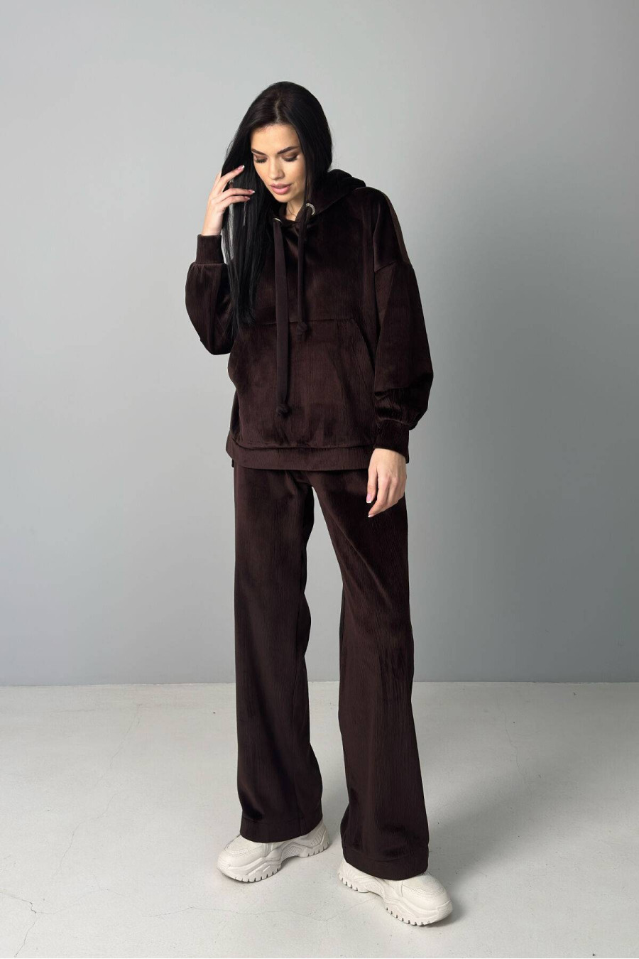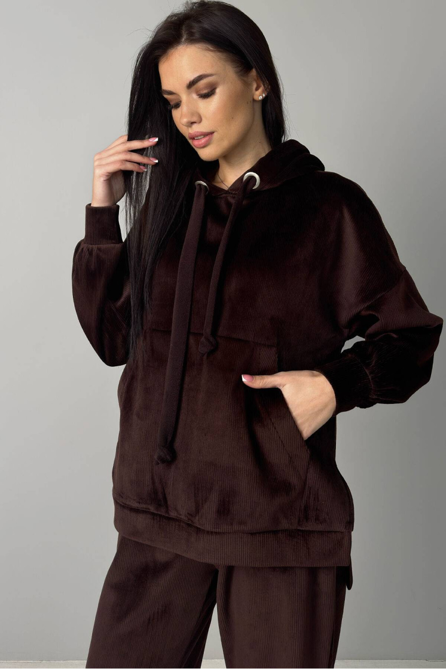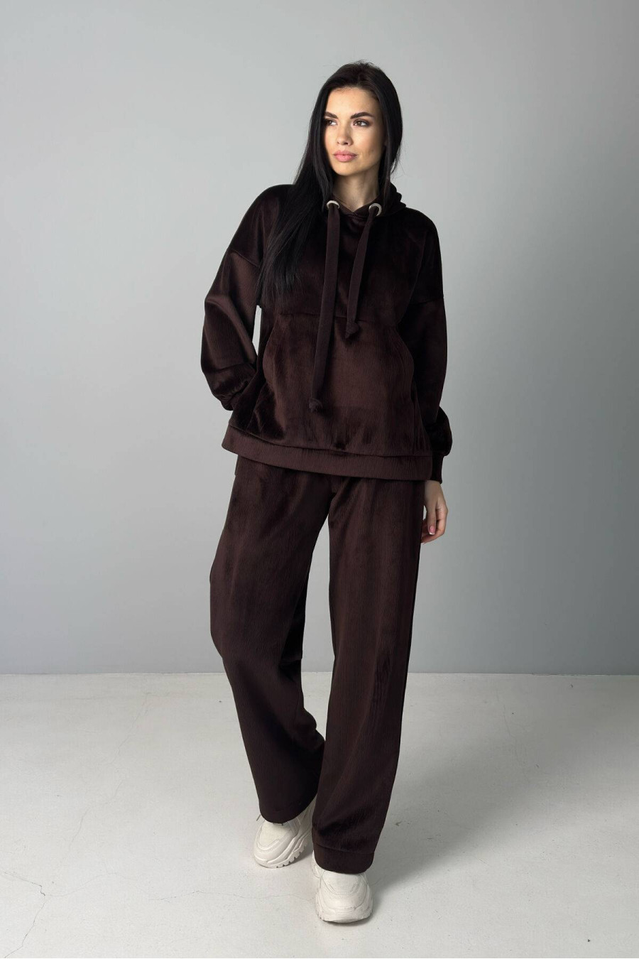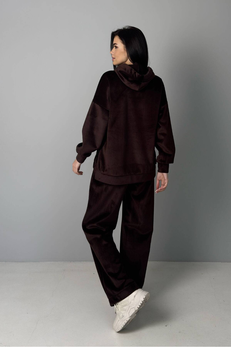 The chocolate-colored tracksuit "Monsoon" is made of velveteen on fleece, combining style and practicality. The upper part of the set is a sweatshirt with a straight silhouette with a hood and a kangaroo pocket. The sleeve with a dropped shoulder ends with a wide cuff. The bottom of the sweatshirt has slits in the side seams. The emphasis is on the large drawstring of the hood. The bottom of the set is loose-fitting pants with an elastic band with side pockets in the seams. The suit "Monsoon" is about freedom, beauty and comfort at the same time.