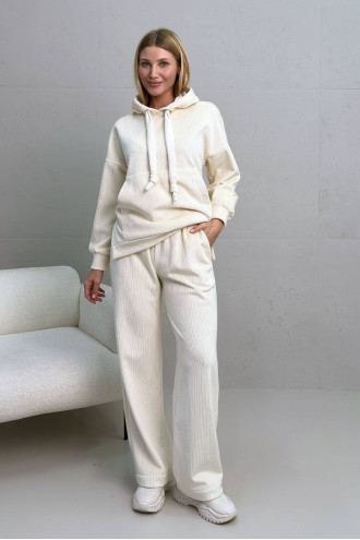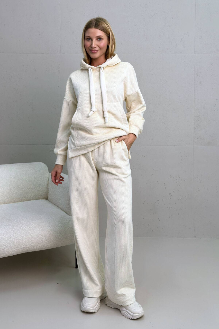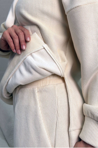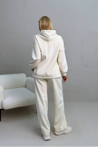 The "Monsoon" tracksuit in milky color is made of velveteen on fleece, which combines style and practicality. The upper part of the set is a sweatshirt with a straight silhouette with a hood and a kangaroo pocket. The sleeve with a dropped shoulder ends with a wide cuff. The bottom of the sweatshirt has slits in the side seams. The emphasis is on the large drawstring of the hood. The bottom of the set is loose-fitting pants with an elastic band with side pockets in the seams. The "Monsoon" suit is about freedom, beauty and comfort at the same time.