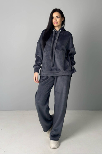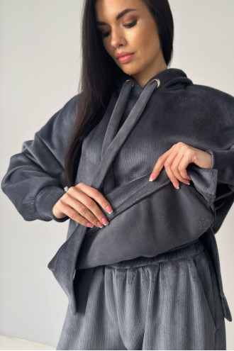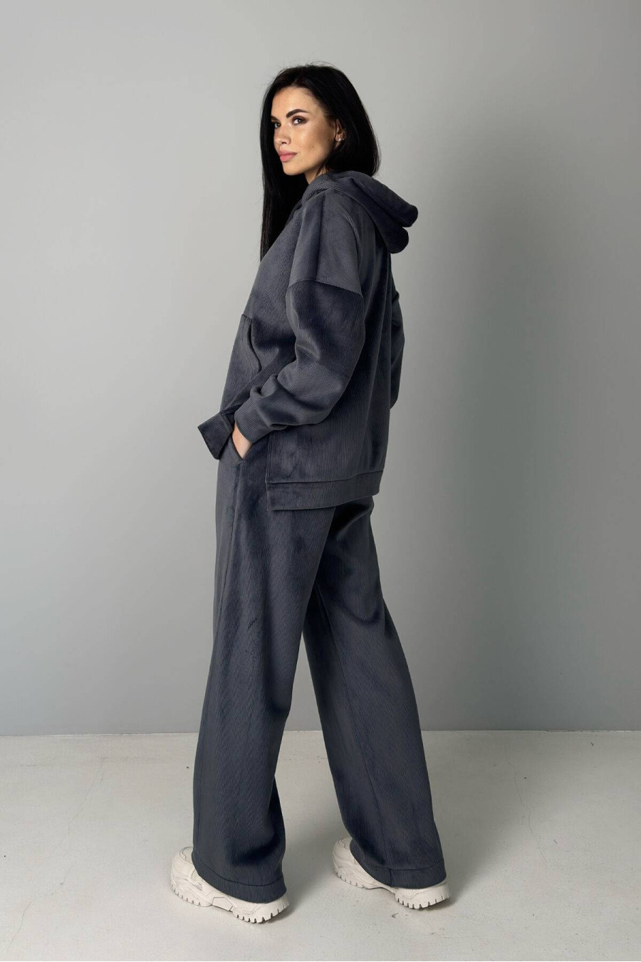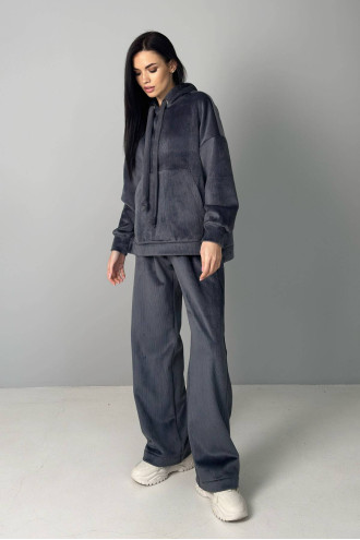 The "Monsoon" tracksuit in fume color is sewn from corduroy on fleece, which combines style and practicality. The upper part of the set is a sweatshirt of a straight silhouette with a hood and a kangaroo pocket. The sleeve with a dropped shoulder ends with a wide cuff. The bottom of the sweatshirt has slits in the side seams. The emphasis is on the large drawstring of the hood. The bottom of the set is loose-fitting pants with an elastic band with side pockets in the seams. The "Monsoon" suit is about freedom, beauty and comfort at the same time.