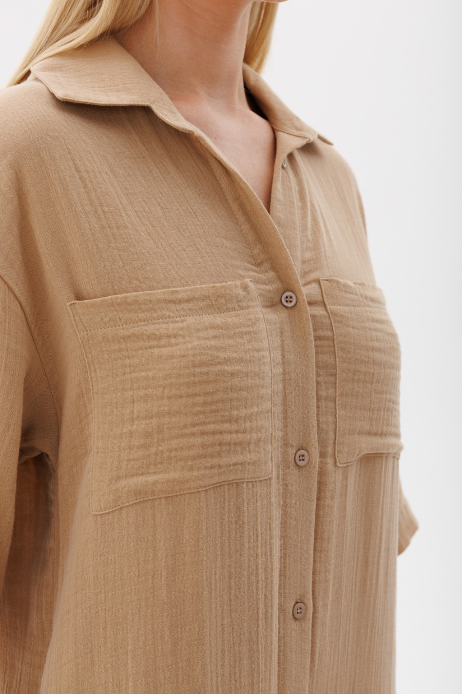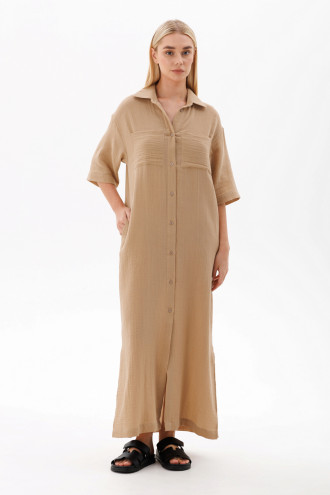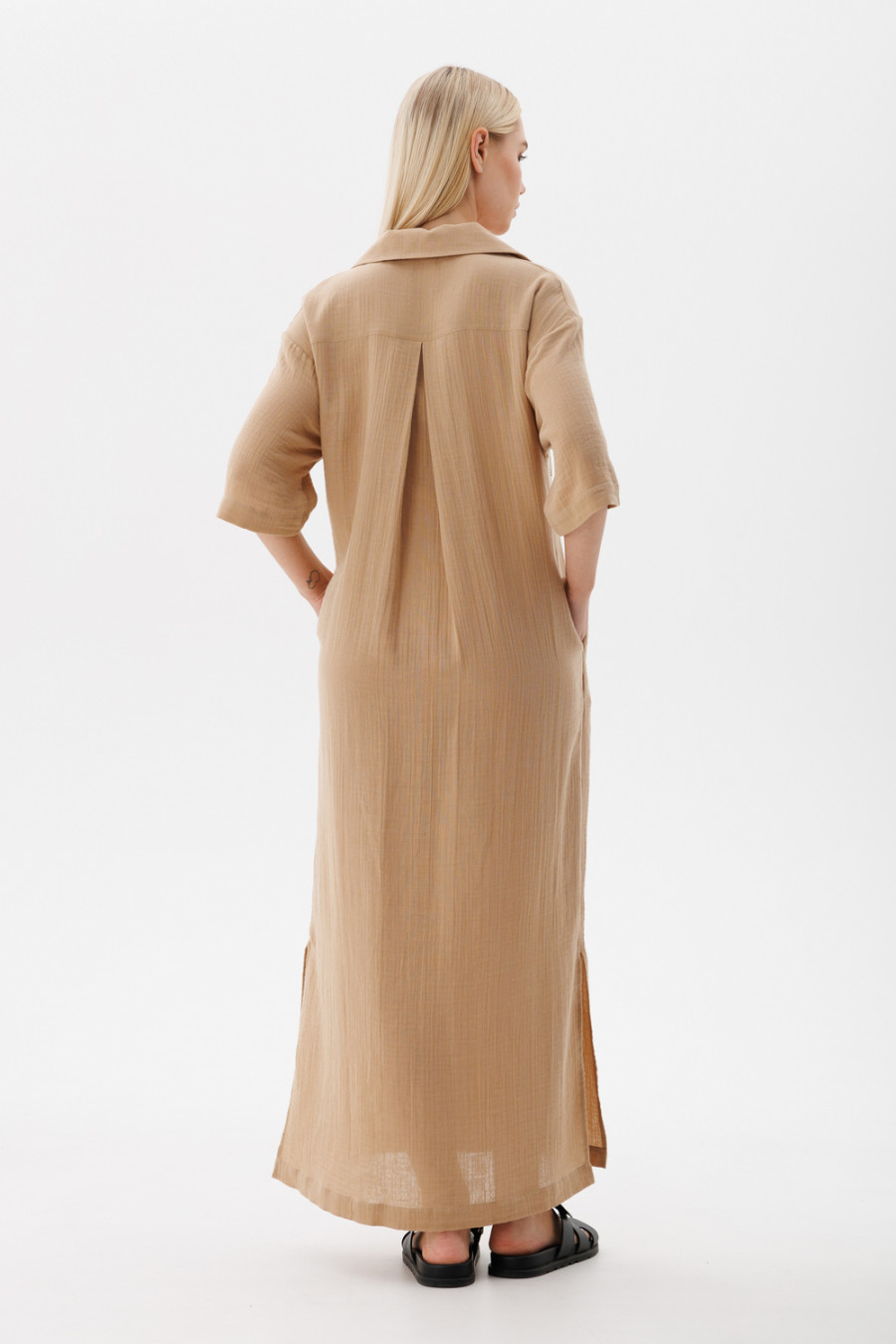 Original light long bathrobe made of muslin fabric in beige-sand color. Free-cut model with a stand-up collar, a yoke with gathers on the back, a dropped shoulder line, spacious short sleeves, a placket with button fasteners from the collar to the hem, patch pockets on the chest, slits in the side seams. The bathrobe will emphasize the fragility of the forms and the femininity of the image. The outfit will be appropriate both for home and for relaxing on the beach.