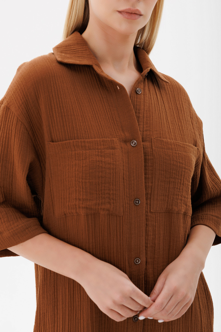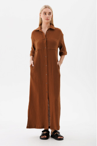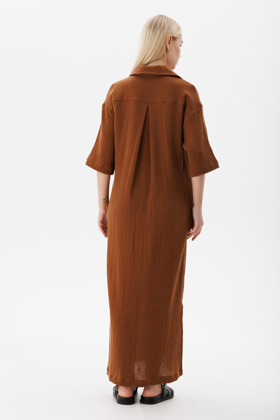 Brown-terracotta long bathrobe made of light textured muslin fabric that is pleasant to the body. Loose-fitting model with a stand-up collar, a yoke with gathers on the back, a dropped shoulder line, spacious short sleeves, a placket with button fasteners from the collar to the hem, patch pockets on the chest, slits in the side seams. The bathrobe will emphasize the fragility of the forms and the femininity of the image. The outfit will be appropriate both for home and for a vacation on the beach.
