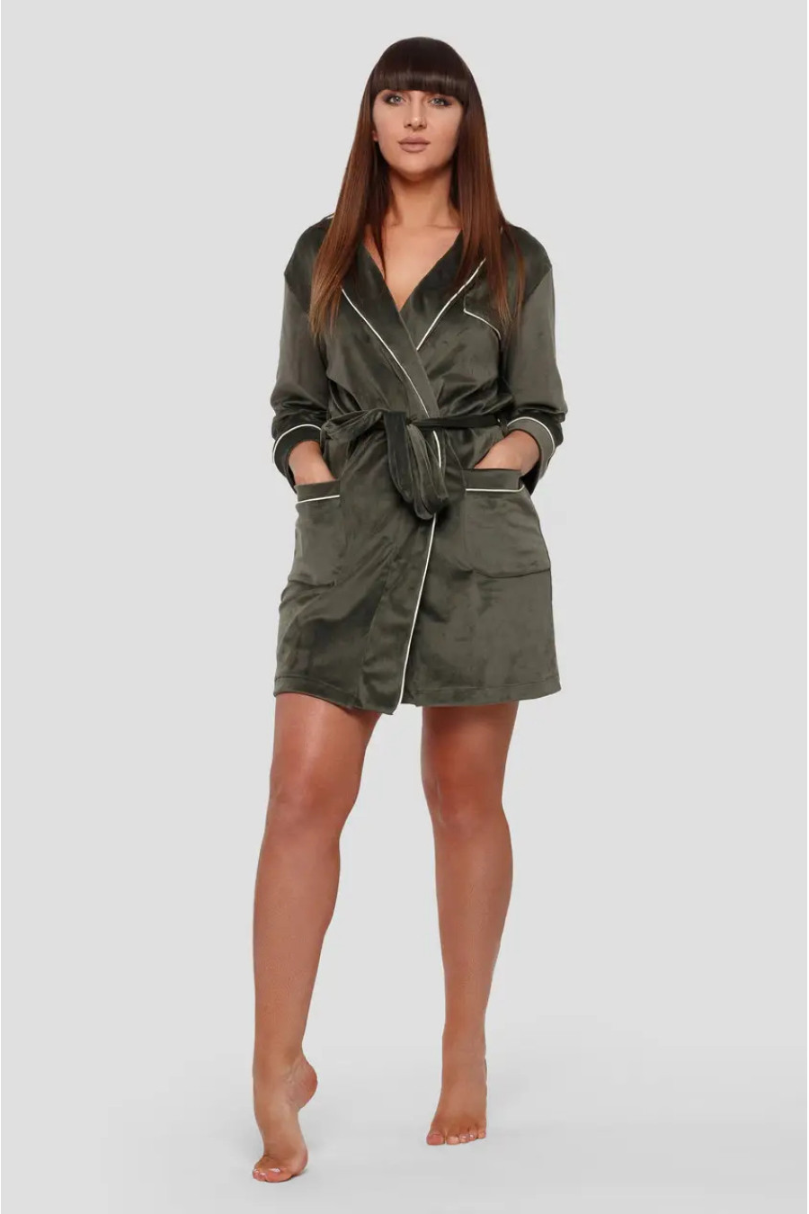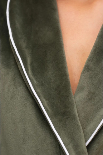 Cozy khaki bathrobe "Lydia" is made of plush velour on a cotton base. The model is fitted, with two pockets and three-quarter sleeves, decorated with contrasting white piping. The fabric with a soft pile pleasantly fits the body, gives warmth and tenderness after a bath or during morning coffee. The velour bathrobe looks beautiful and adds a feeling of comfort and well-groomedness.