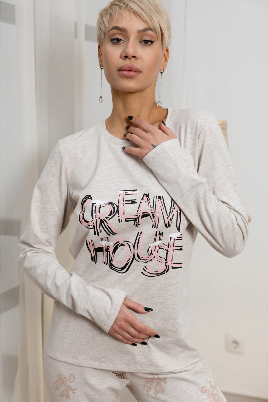 Knitted women's pajamas made of soft melange cotton fabric in light gray with a house print and an inscription. The model consists of a loose-fitting sweater with a round neck with an elastic band, long, wide sleeves without cuffs, and pants with an elastic band and elastic cuffs at the bottom. The pajamas will emphasize the fragility and elegance of the image, and will give a feeling of warmth. The outfit will complement the home wardrobe of any young lady.