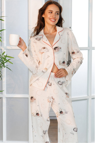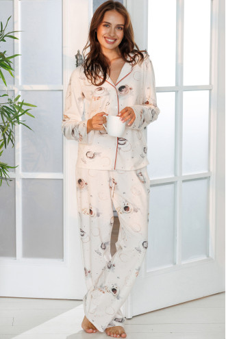 Cream-white warm women's pajamas made of cotton fabric with a coffee cup print and terracotta border decor. The model consists of a spacious shirt with a turn-down collar with lapels, a dropped shoulder line, long sleeves with cuffs, button fastenings on the shelf and elongated loose pants with an elastic waistband, detachable cuffs with decor. The pajamas will warm up a cool morning and give a feeling of comfortable freedom.