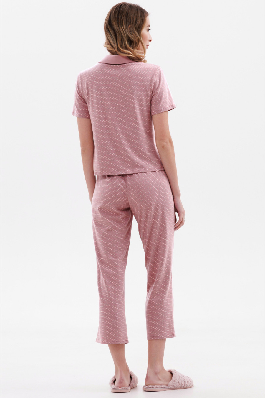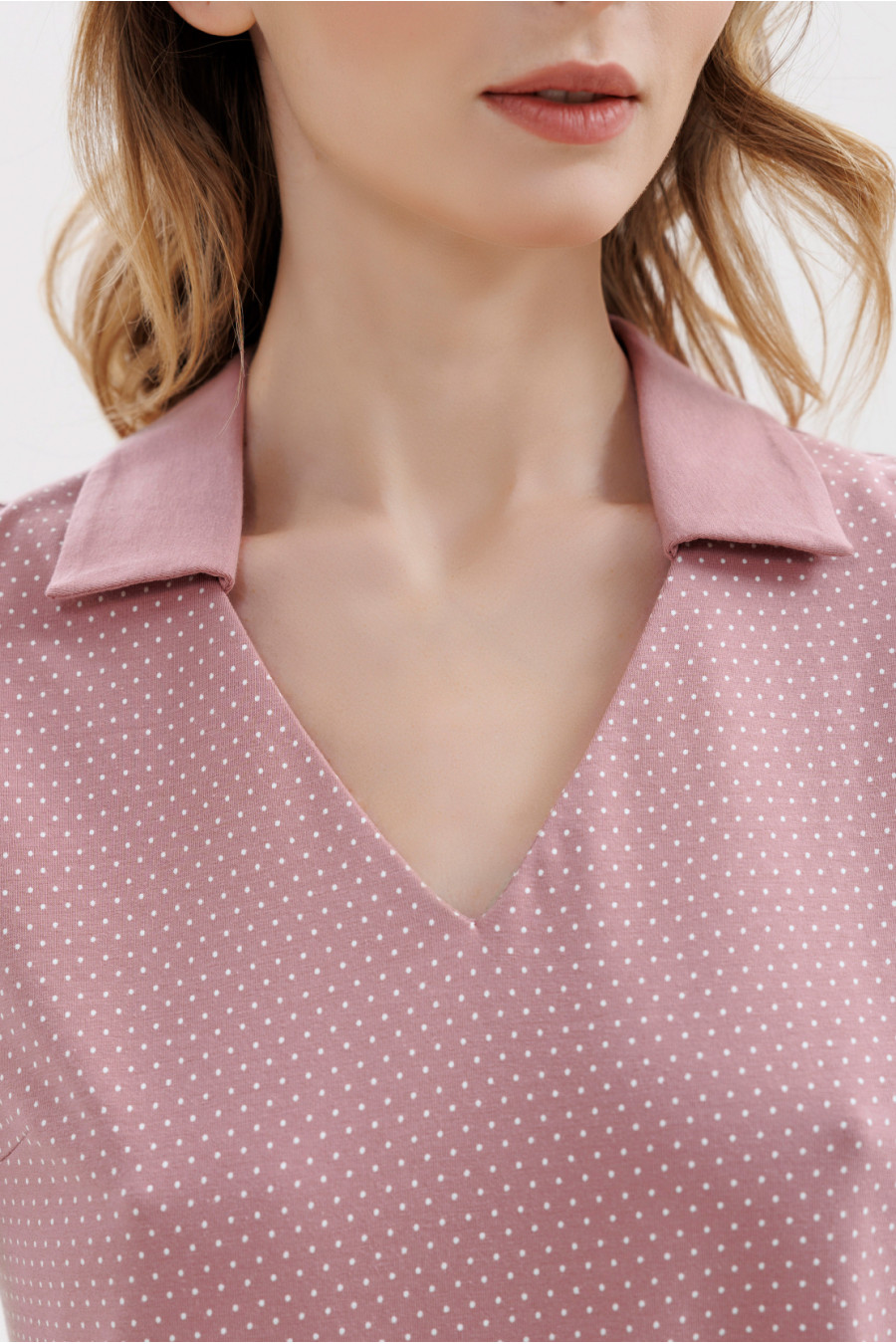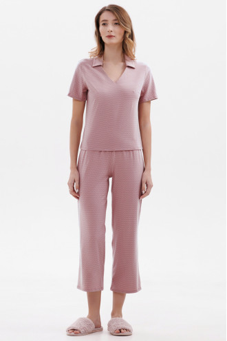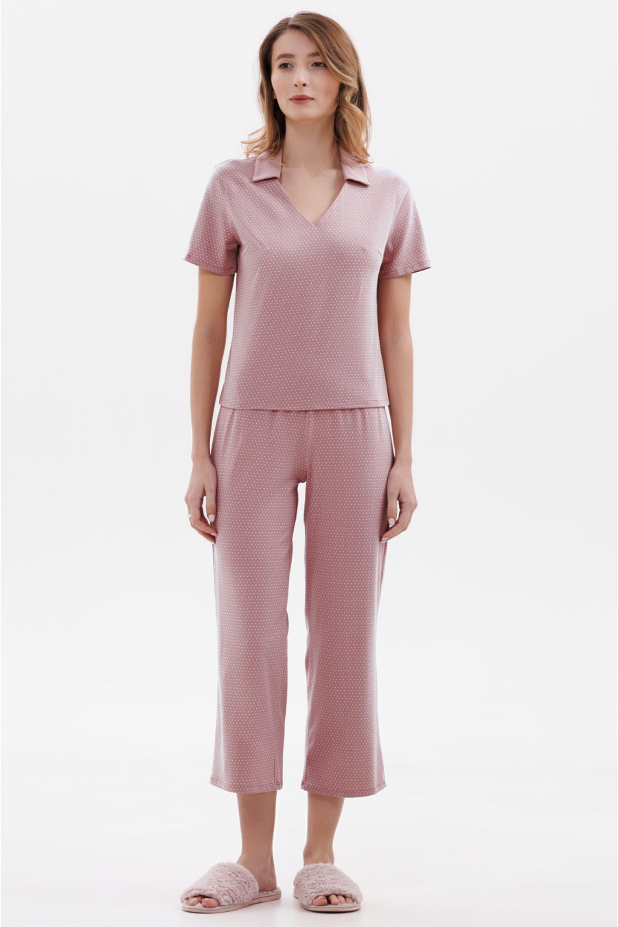 Dark pink knitted cotton women's pajamas made of natural fabric that is pleasant to the body with a small polka dot print, which will add tenderness to the girlish image. The model consists of a fitted T-shirt with a turn-down collar, a V-neck, short sleeves, chest pockets and spacious breeches with an elastic waistband. The pajamas will give a feeling of comfort and freedom, will make the morning more pleasant.