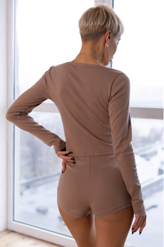 Playful women's pajamas made of textured cotton knitwear in light brown. The model consists of a cropped sweater with a fitted silhouette with a deep square neckline, narrow long sleeves without cuffs and short shorts with a narrow elastic waistband. The pajamas will emphasize the slimness and grace of the forms, add sophistication and charm to your home wardrobe. The outfit is suitable not only for sleeping, but also for leisure at home with a cup of tea.