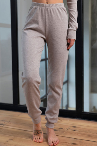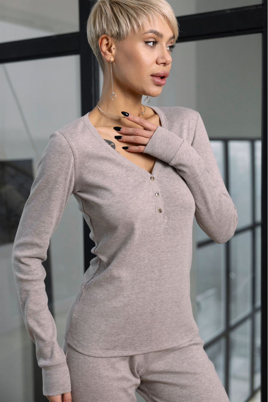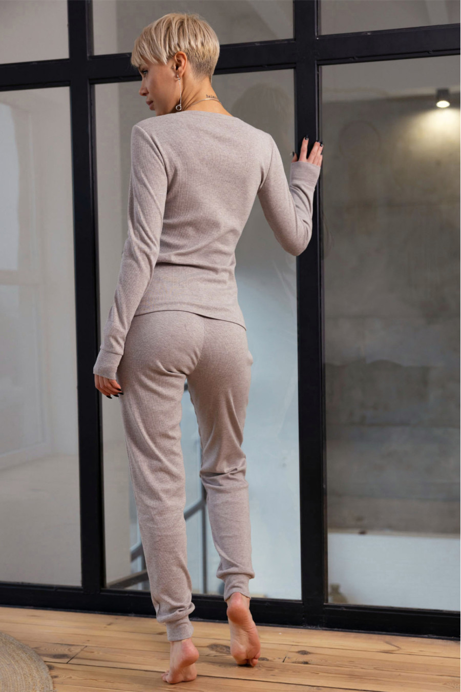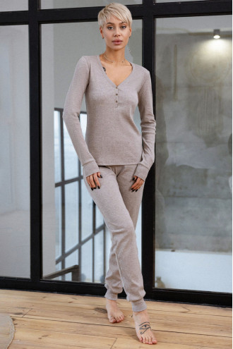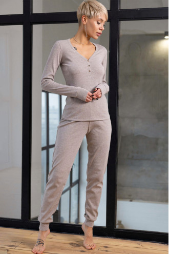 Dark beige comfortable women's pajamas made of mixed melange ribbed knit fabric. The model consists of a fitted sweater with a deep V-neck, narrow long sleeves with cuffs, button fastenings on the shelf and "fit-to-size" pants with an elastic waistband and high cuffs at the bottom. The pajamas will emphasize the fragility and femininity of the silhouette, warm you in the cold season and give you a feeling of cozy peace.