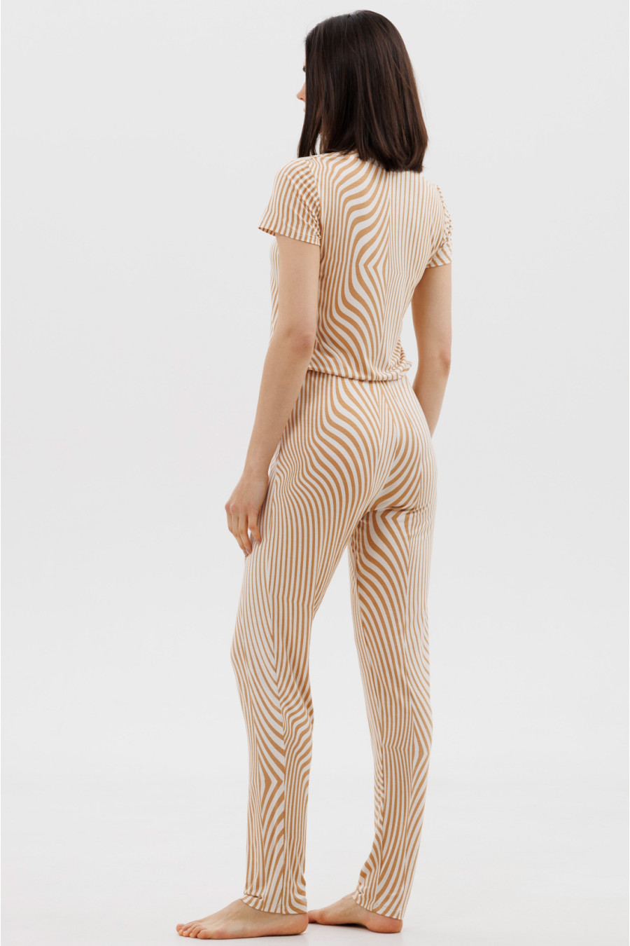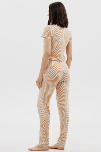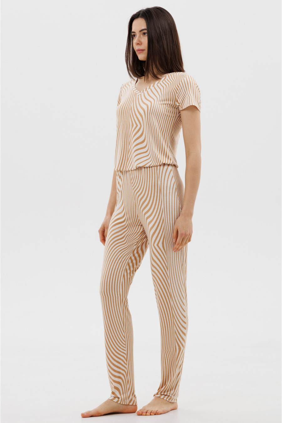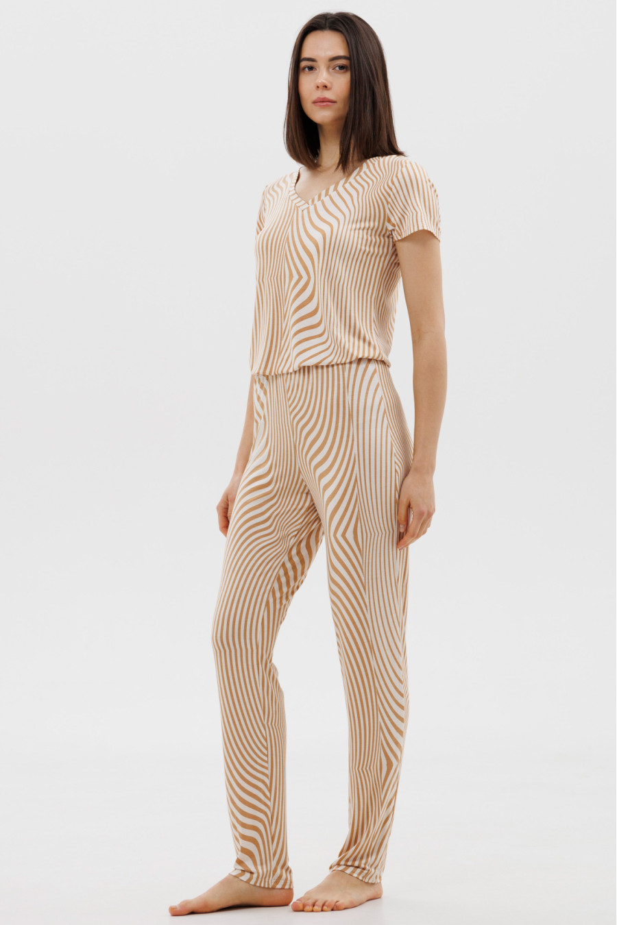 Women's pajamas made of smooth, comfortable viscose knitwear in light beige with a terracotta striped print. The model consists of a loose-fitting T-shirt with a V-neckline with a sewn-in lining, short sleeves and elongated, fitted pants with an elastic waistband. The pajamas will refresh your home wardrobe and add playfulness to your look. The outfit will be appropriate for both relaxation and a good option for a home suit.