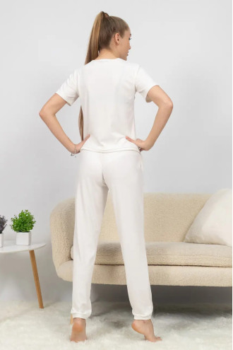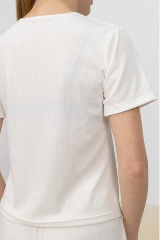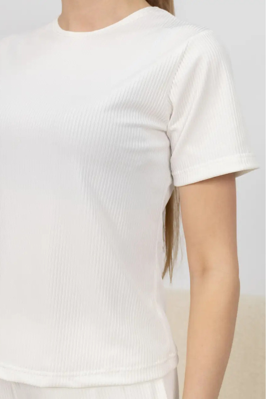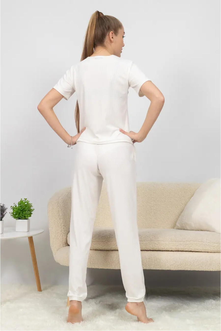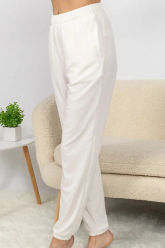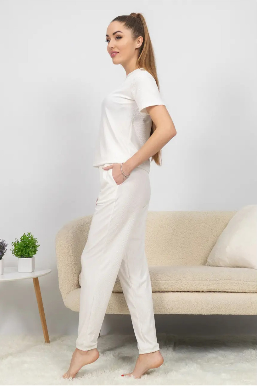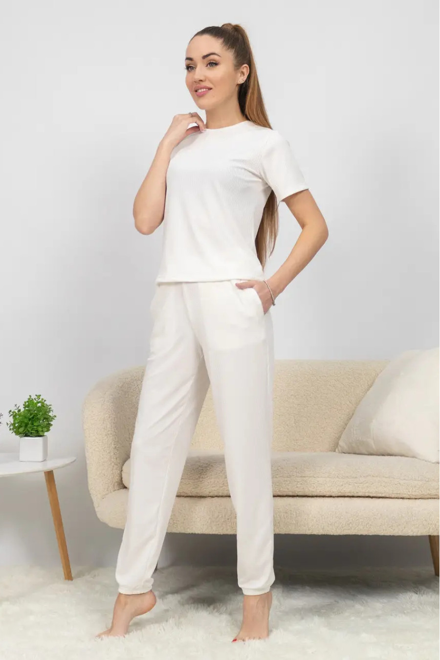 Pajamas "Adagio" white are made of rib knitwear. The top is a T-shirt with short sleeves, a round neck. The bottom is pants with in-seam pockets and gathered at the bottom with an elastic band. The fabric stretches well in width and is resistant to stretching in length. Pleasant to the touch, light, and easy to care for. The style of the set allows you to use it as a home suit.