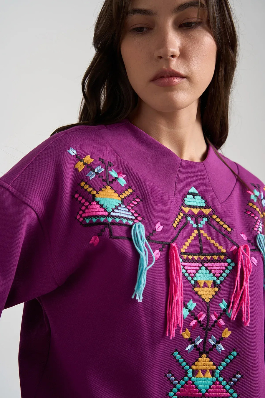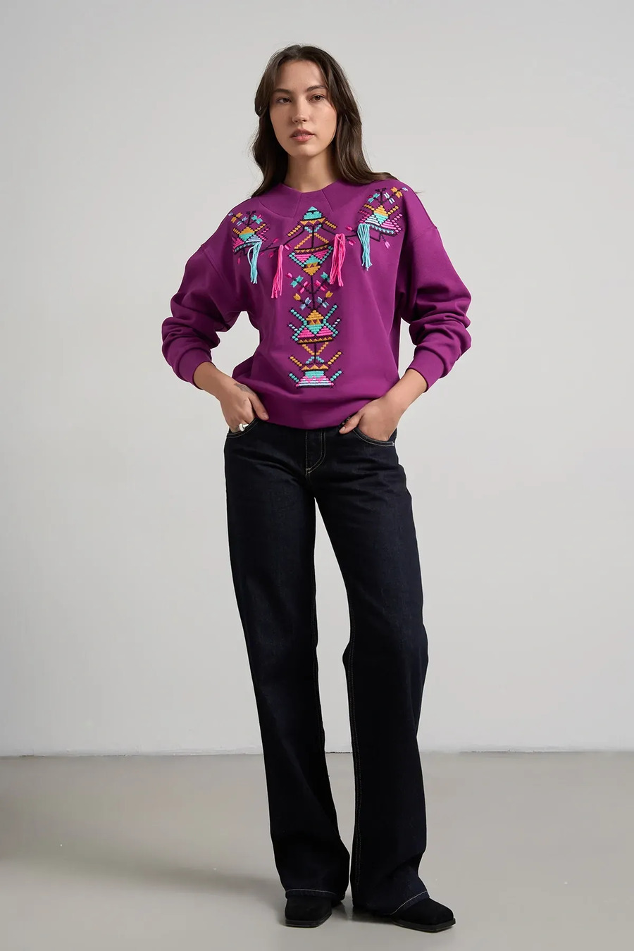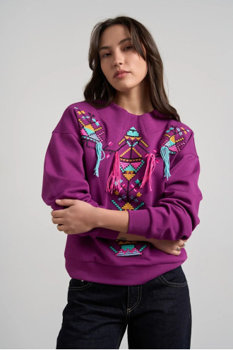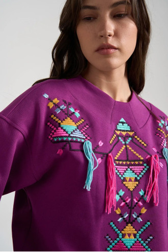 Sweatshirt - a convenient and versatile element of everyday wardrobe, combining comfort and expressive design. The model has a loose silhouette, a round neck, long sleeves with cuffs and a neat fit, which ensures comfort when wearing. Made of cotton fabric, pleasant, breathable and light. The accent of the product is a bright ornament located in the center and shoulders, combining geometric motifs and multi-colored decorative elements, which makes the sweatshirt expressive and original.