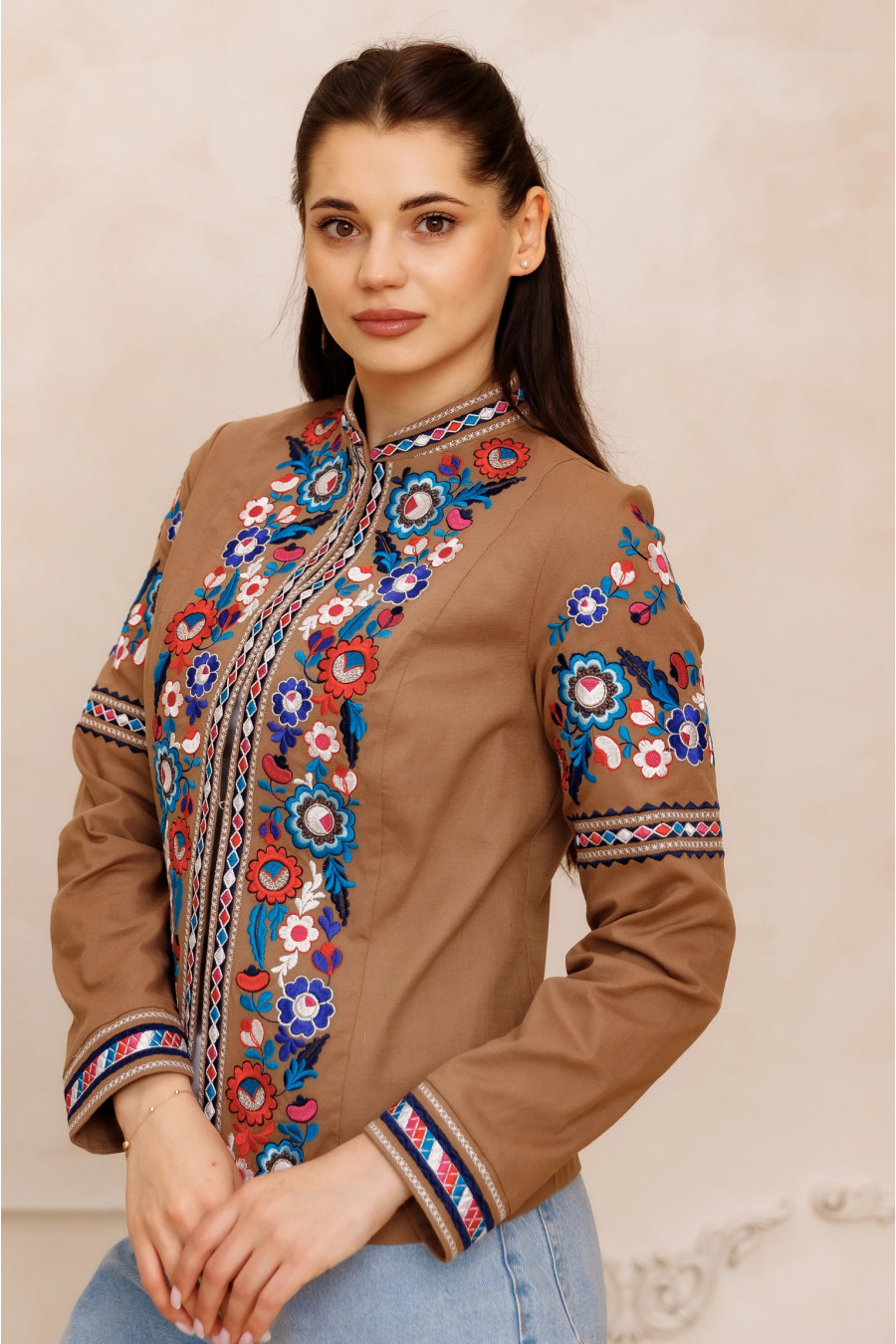 Linen jacket - a light and elegant model that emphasizes the natural beauty of the material and the delicate taste of the owner. A straight silhouette model with a stand-up collar without a clasp, which is comfortable to wear and does not constrain movements. The jacket is decorated with embroidery in the form of flowers, made in the smooth technique. Decorative trim on the collar, sleeves, cuffs and along the product, which gives it expressiveness. The fabric is breathable and pleasant to the touch, gives a feeling of lightness and natural elegance.