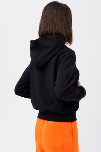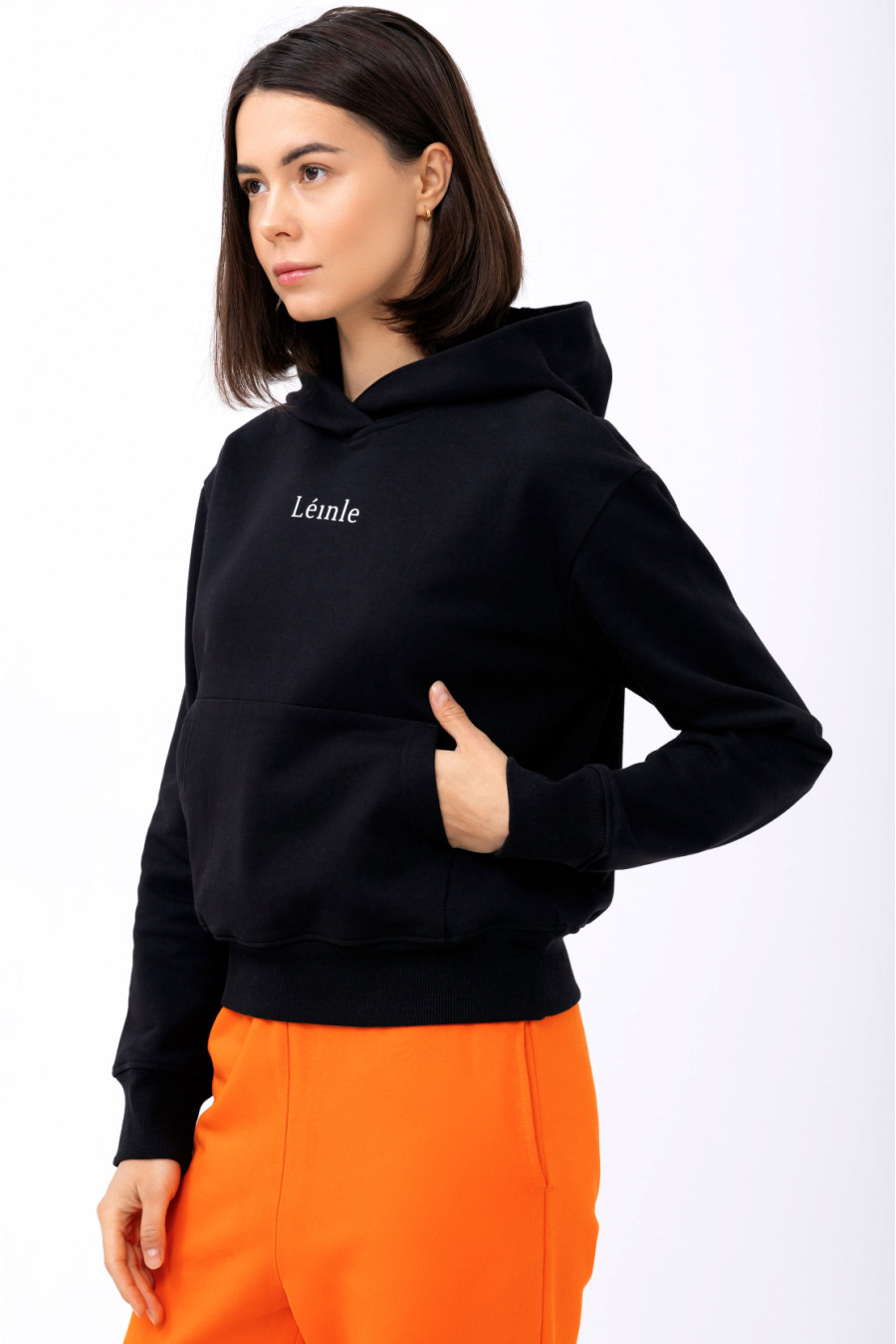 Stylish demi-season sweatshirt made of body-pleasing black cotton jersey with a decorative inscription. A loose-fitting model with a cozy hood, dropped shoulders, long sleeves with sewn-in elastic cuffs and a cuff at the hem, and a roomy kangaroo pocket. The sweater will give you a feeling of comfortable warmth in cool weather and will add a touch of understated elegance to your look. The outfit can be complemented with classic-style trousers, jeans, or sweatpants.