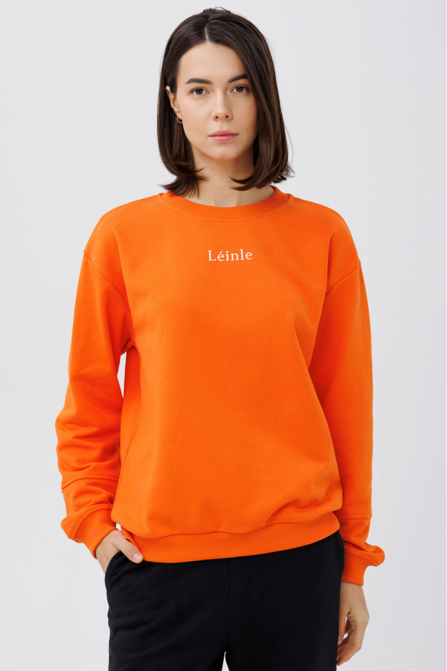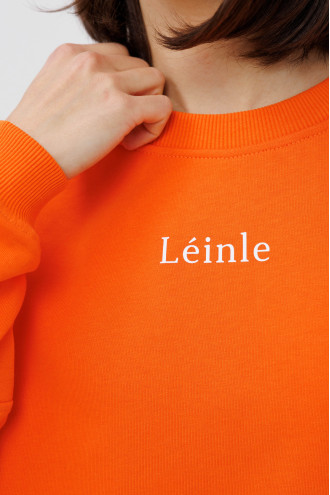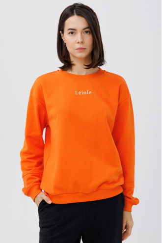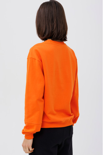 Orange-carrot demi-season knitted jumper made of natural cotton fabric with a decor-inscription that will refresh a girl's wardrobe. A loose-fitting model with a round neck with an elastic band, a dropped shoulder line, long sleeves with sewn-in elastic cuffs and a cuff on the hem. The jumper will emphasize the slimness and femininity of the figure, add style to the image. The outfit will complement the wardrobe of an active young lady and goes well with various bottom options.