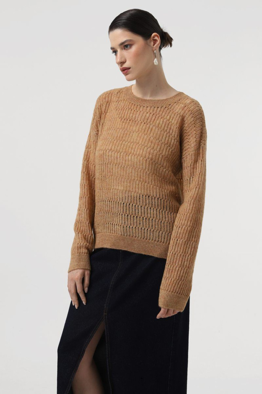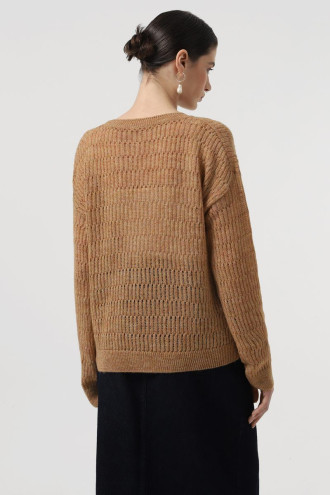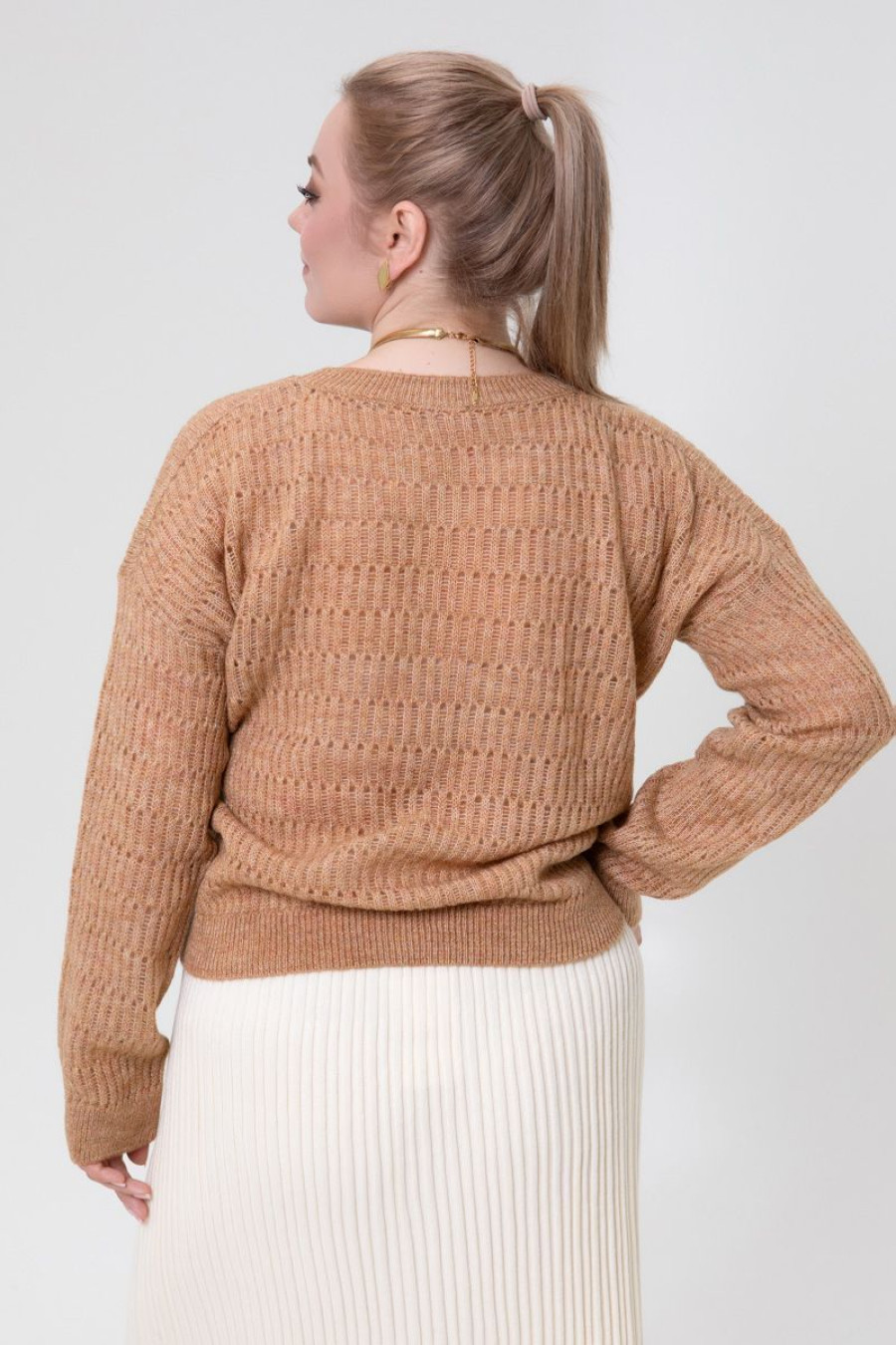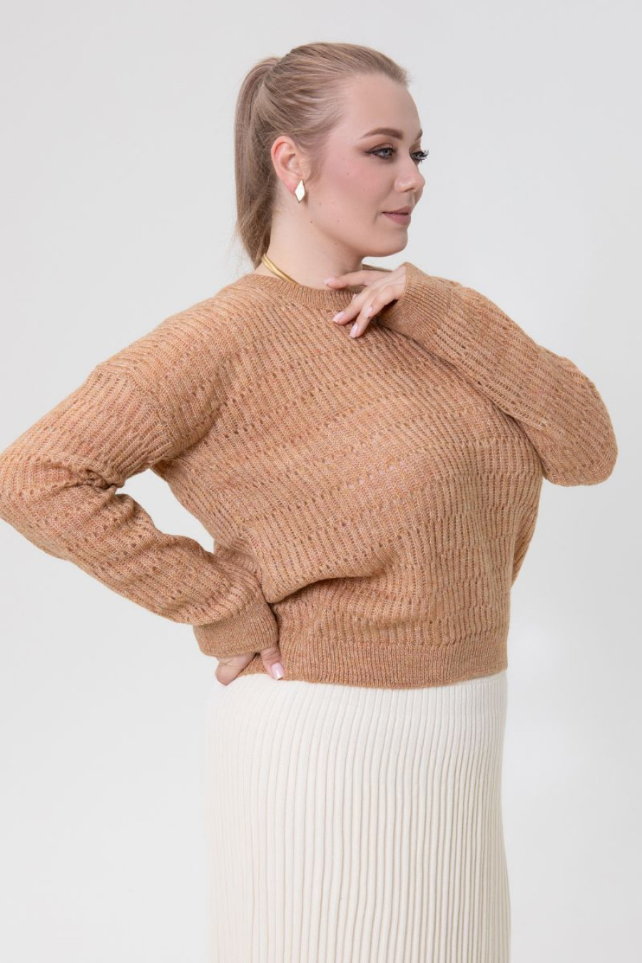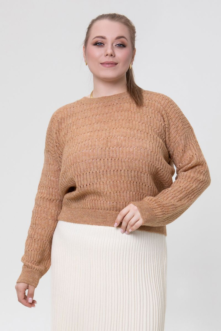 Demi-season knitted jumper made of pleasant to the body half-wool yarn in camel color with an airy openwork pattern that will decorate any look. A loose-fitting model with a wide round neck with an elastic band, a dropped shoulder line, long spacious sleeves with elastic cuffs and a cuff at the hem. The jumper will add charm and femininity to a girl's everyday look, emphasizing the fragility and elegance of the forms. The outfit will complement the demi-season wardrobe of any young lady and goes well with both classic business bottoms and casual models.