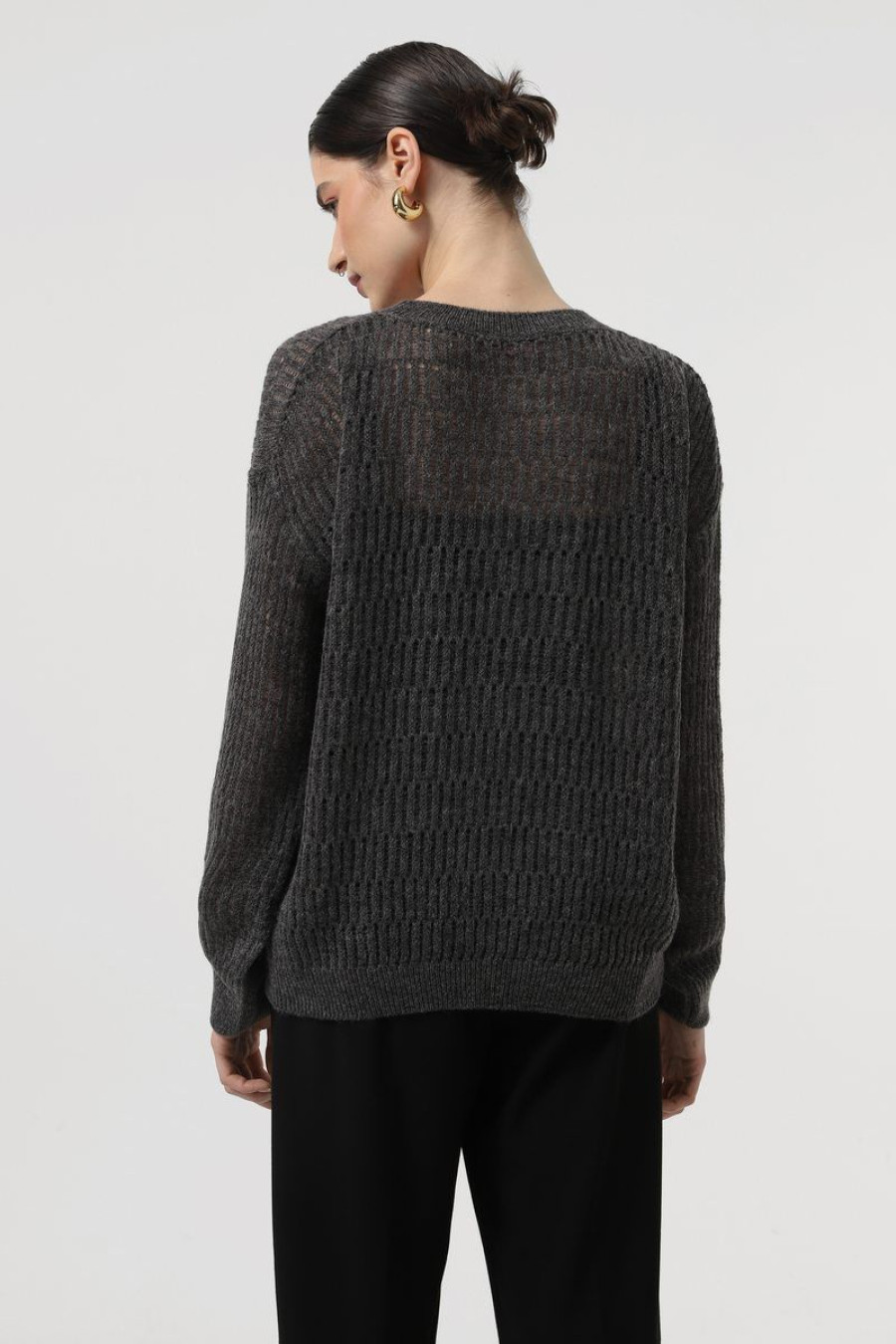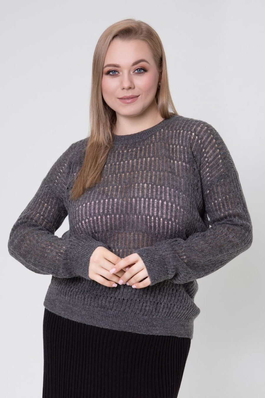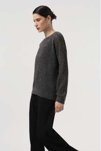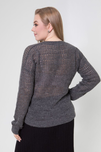 Stylish demi-season knitted jumper made of half-woolen yarn in dark graphite color with an airy openwork pattern. Loose-fitting model with a wide round neck with an elastic band, a dropped shoulder line, long spacious sleeves with elastic cuffs and a cuff at the hem. The jumper will add charm and femininity to a girl's everyday look, emphasize the fragility and elegance of the forms. The outfit will complement the demi-season wardrobe of any young lady and goes well with both classic business bottoms and casual models.