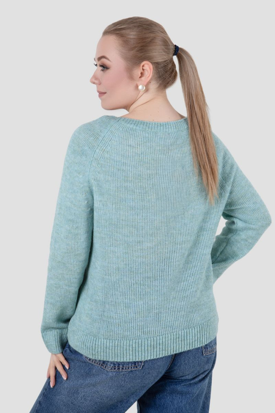 Demi-season knitted sweater made of soft half-woolen melange yarn in menthol-artemisia color with a smooth openwork pattern-elastic band. Loose-fitting model with a wide round neck with elastic band-beak, long spacious raglan sleeves with elastic cuffs and a cuff on the hem. The sweater will emphasize the fragility and femininity of the forms, will add style to the image. The outfit will complement the everyday wardrobe and goes well with both business trousers and jeans or trousers in a sporty style.