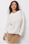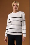 Cozy elongated sweater made of warm wool yarn in caramel-beige and black with a thin plain weave. A loose silhouette model with a round neck with an elastic band, a dropped shoulder line, long spacious sleeves with wide elastic cuffs and an elastic band at the hem. The sweater will emphasize the fragility and grace of the figure, add elegance and romance to the girlish image. The outfit will complement the winter casual office wardrobe and will go well with both classic business bottoms and jeans or pants with fleece.