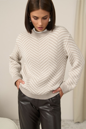 Charming demi-season jumper made of premium beige yarn with milky inserts. Loose silhouette model with a round neck, decorative neat elastic on the cuffs and along the bottom of the product. Characteristic pattern in the form of V-shaped lines adds texture and looks restrained but elegant.