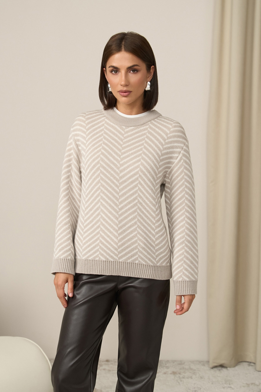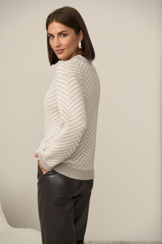 Charming demi-season jumper made of premium beige yarn with milky inserts. Loose silhouette model with a round neck, decorative neat elastic on the cuffs and along the bottom of the product. Characteristic pattern in the form of V-shaped lines adds texture and looks restrained but elegant.