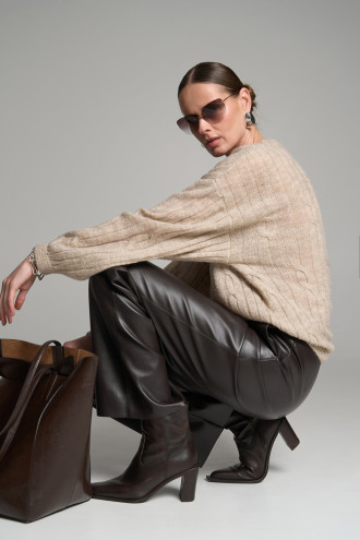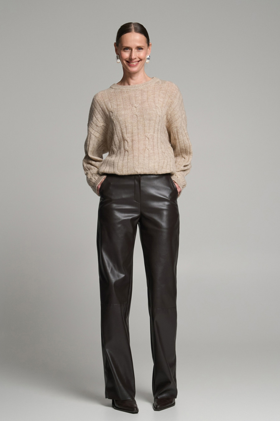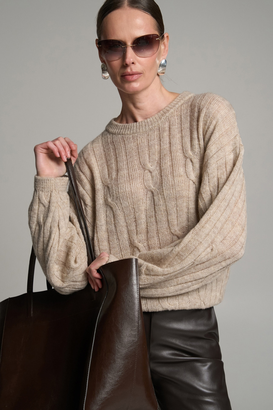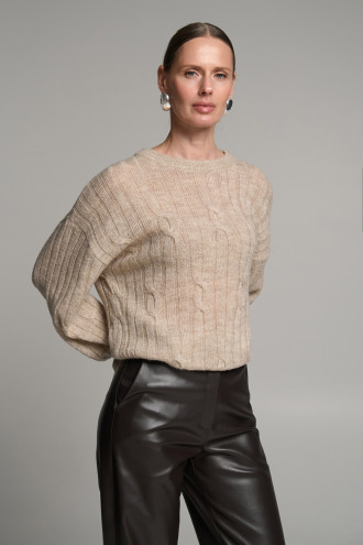 Charming demi-season jumper made of comfortable premium wool in the color of linen with an elegant "braid" pattern. Model made of translucent, thin, textured knit, with a round neck. Sleeve cuffs and bottom of the product are decorated with a fixing elastic band. An ideal choice for comfortable everyday looks in cool weather.