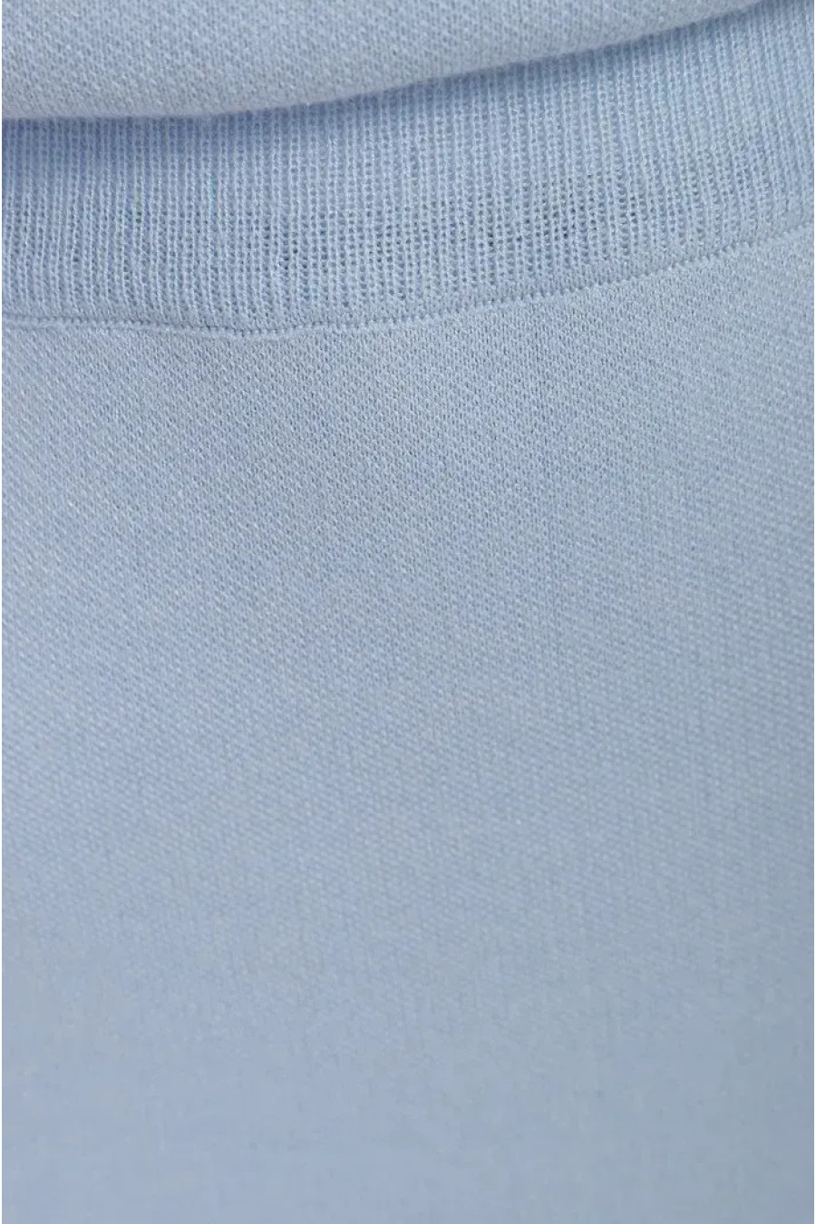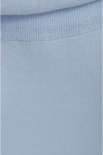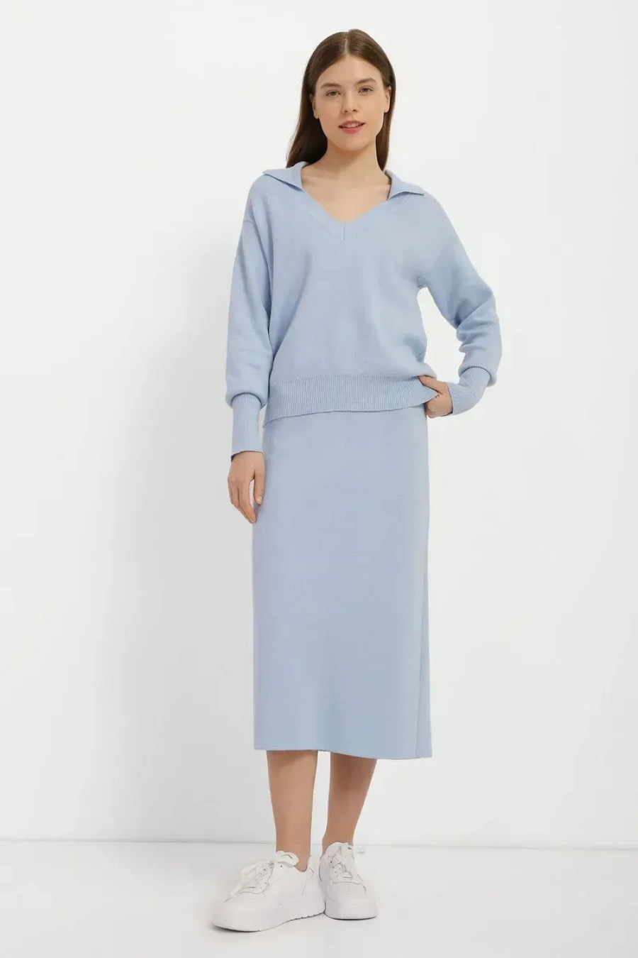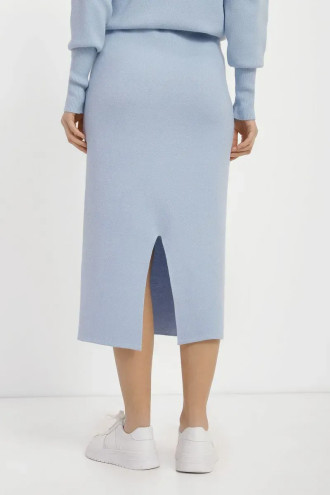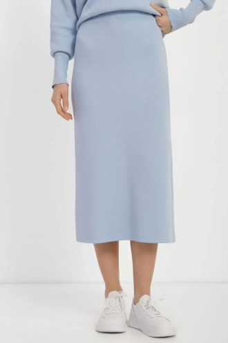 A knitted midi-length skirt in blue will be a highlight of a girl's wardrobe. It has a pleasant and soft structure, stretches well and is comfortable for everyday wear. The model has a straight silhouette with a classic cut at the back of the product, which gives a light accent and ensures comfort during movement. The high elastic band provides a secure fit at the waist.