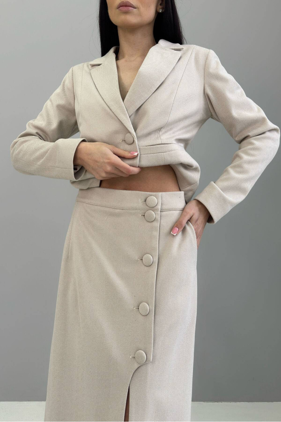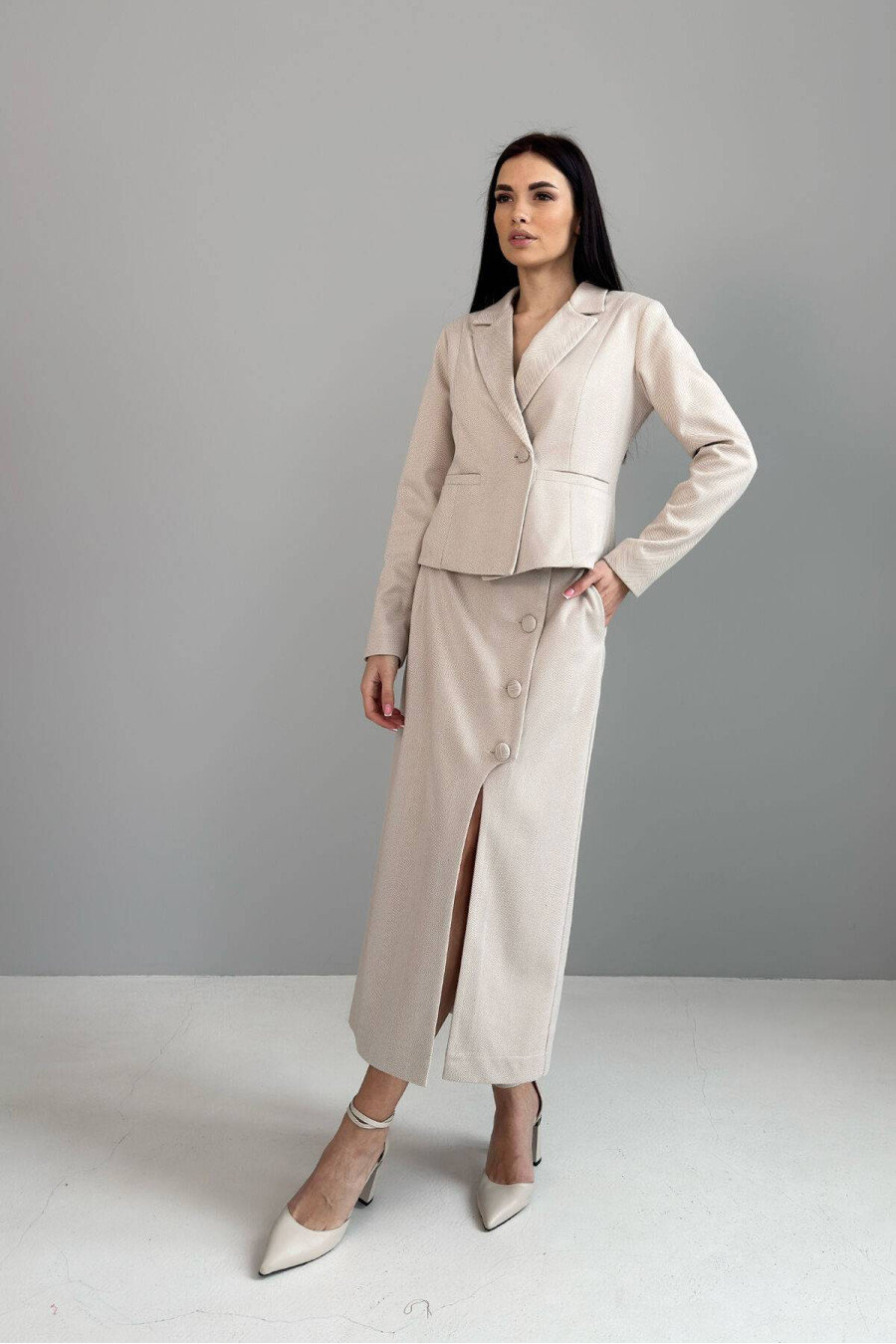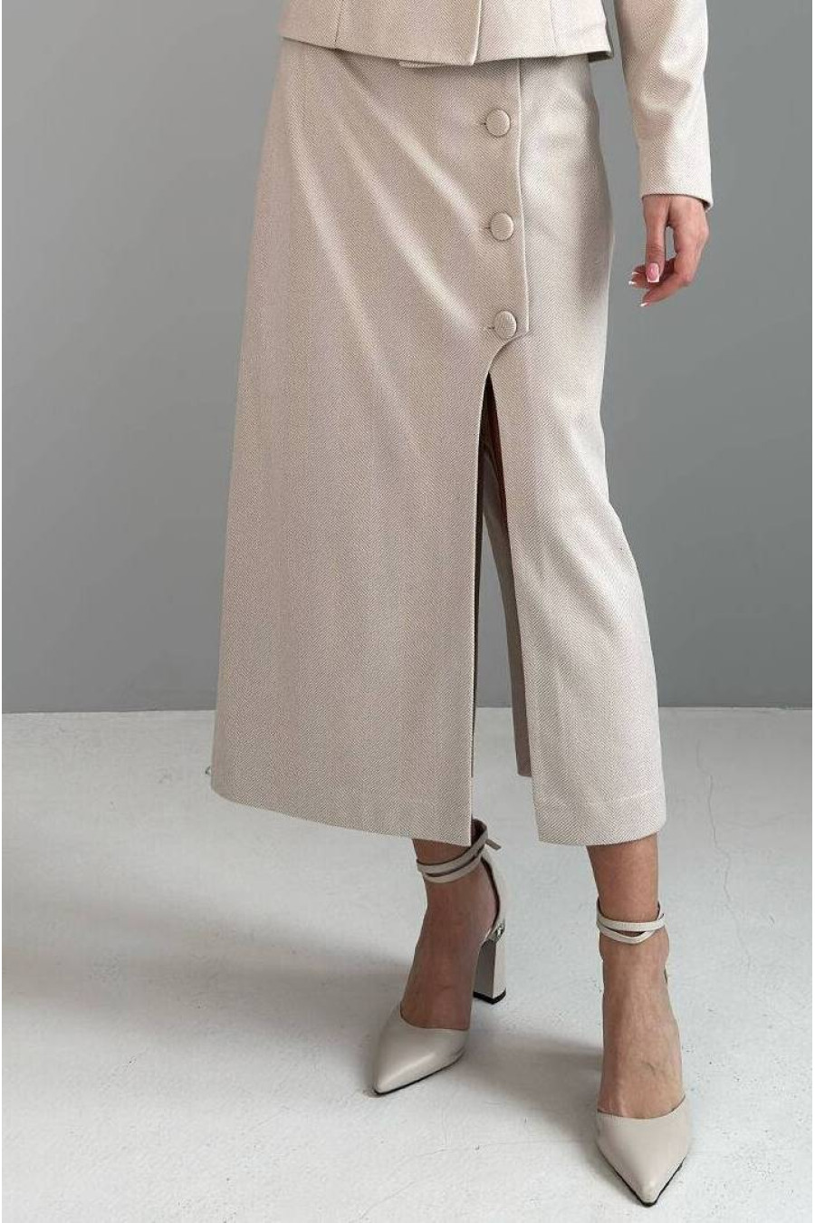 An exquisite demi-season midi skirt made of body-pleasing knitted fabric that will decorate any girl's everyday wardrobe. The straight-cut model will emphasize the fragility and grace of the figure, and the functional buttons make the model comfortable and practical. The stylish cut in the front beautifully opens the leg while walking, creating a sophisticated and attractive accent, but at the same time maintaining restraint. This model is a practical and at the same time elegant base for creating stylish looks in the cool season.