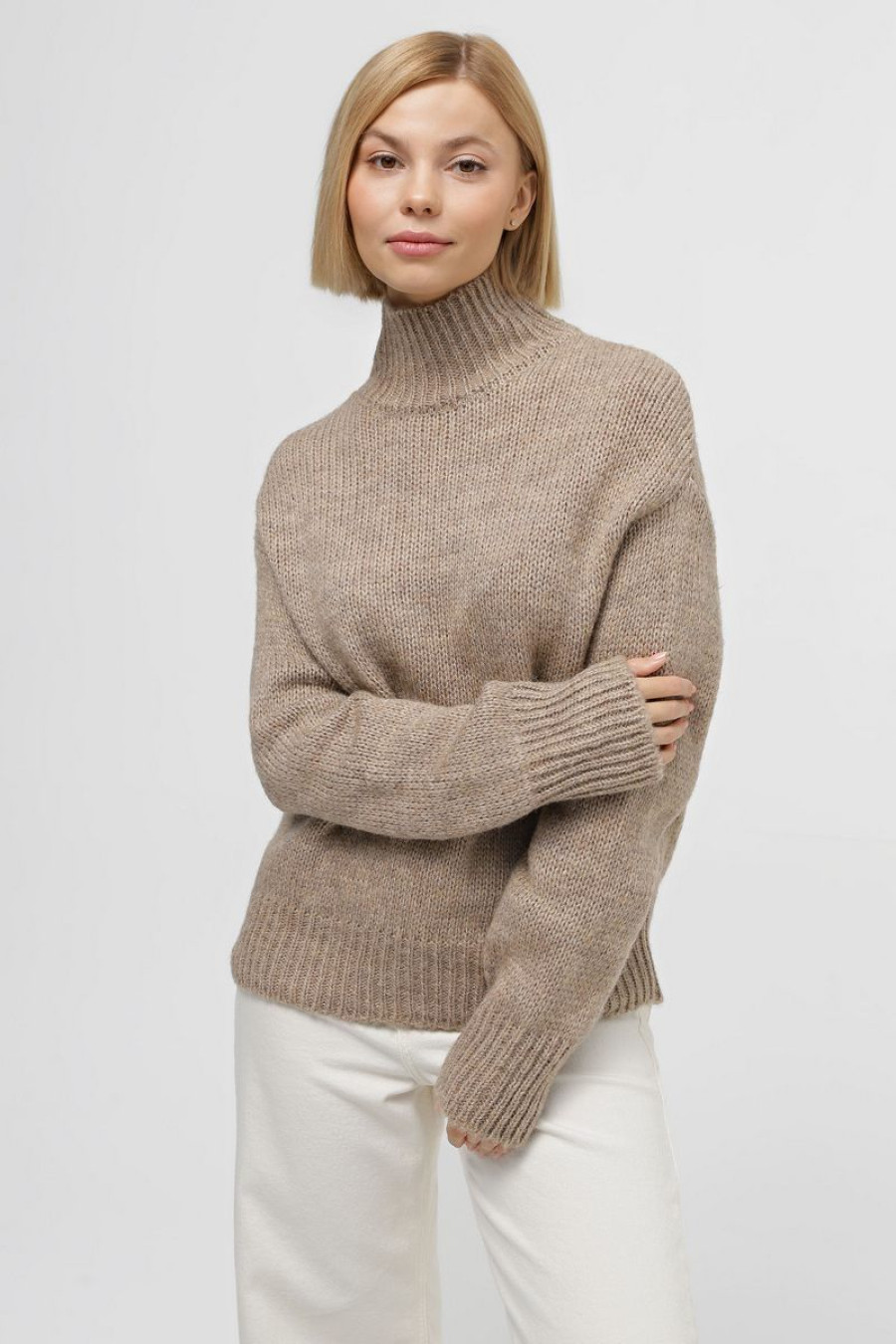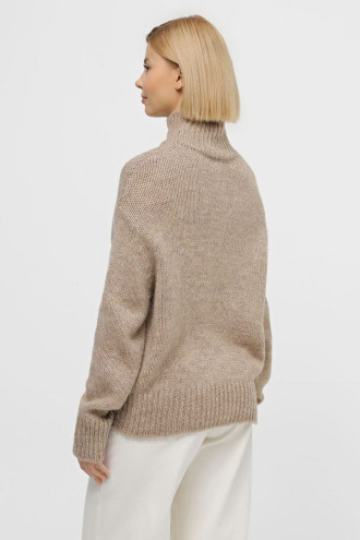 Demi-season warm sweater made of soft, semi-woolen yarn in coffee-beige color, which will give a feeling of comfortable coziness in the winter. Loose-fitting model with a high elastic collar, dropped shoulder line, long spacious sleeves with high elastic cuffs and a wide cuff at the hem. The sweater will add style and charm to the image, emphasize the fragility and femininity of the forms. The outfit will complement the demi-season and winter wardrobe and goes well with any bottom options.