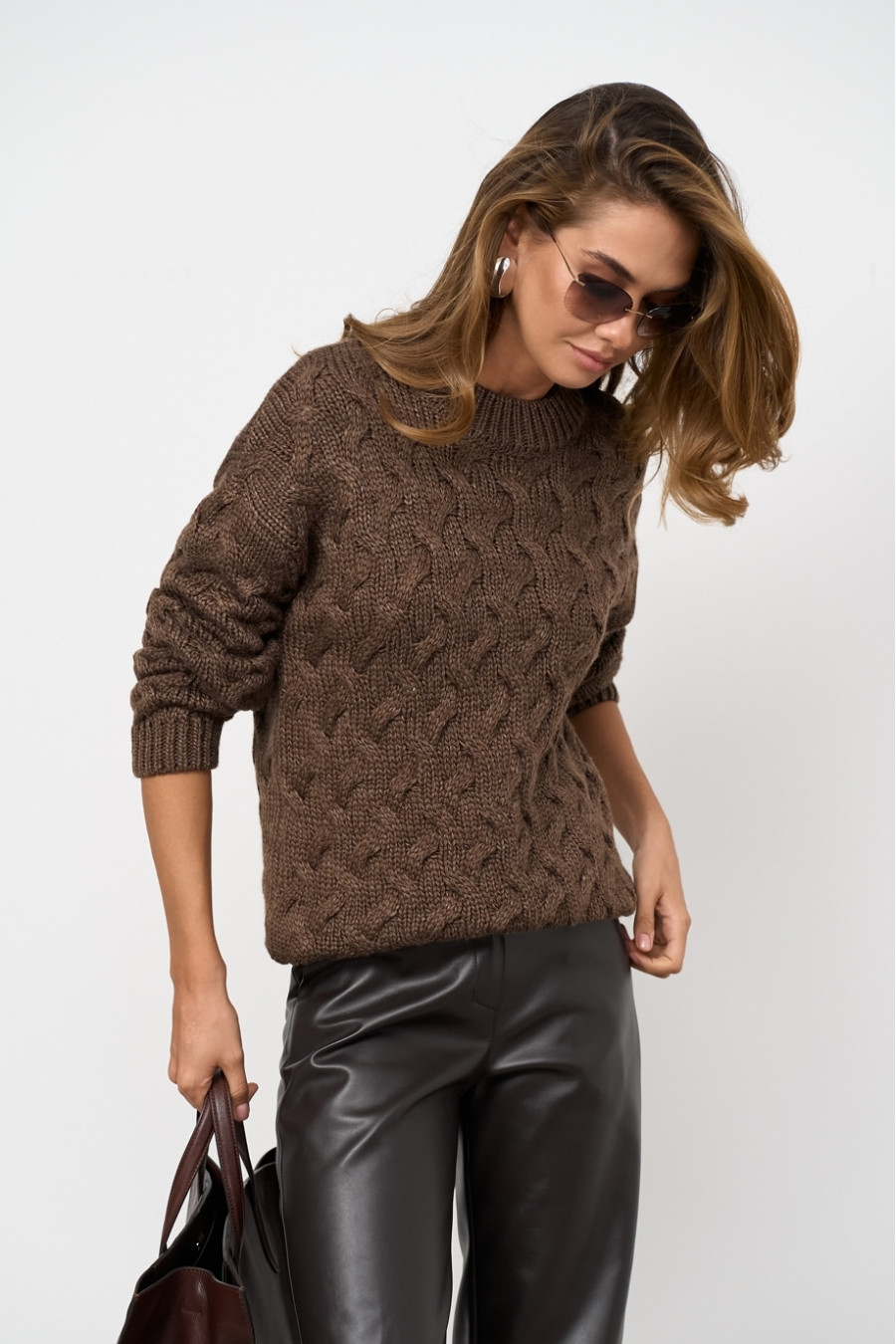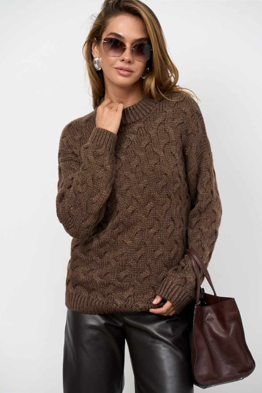 Demi-season warm sweater made of half-woolen yarn in dark bronze with a honeycomb pattern that will decorate the everyday wardrobe of any fashionista. A loose-fitting model with a round neck with an elastic band, a dropped shoulder line, long spacious sleeves with elastic cuffs and a cuff at the hem. The sweater will give a feeling of cozy warmth, add charm and mystery to the image. The outfit can be complemented with both office classics and your favorite casual jeans or sports models.