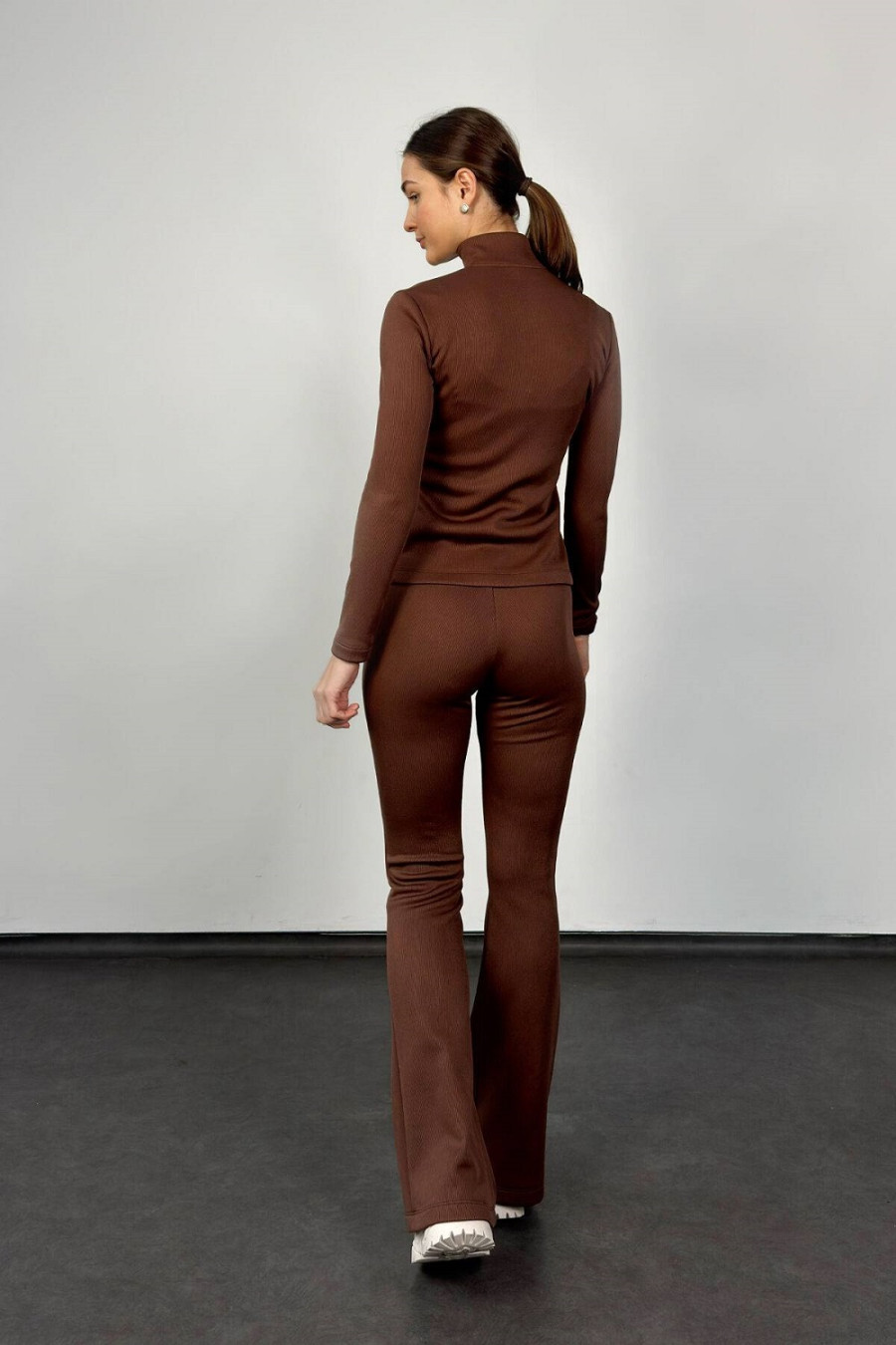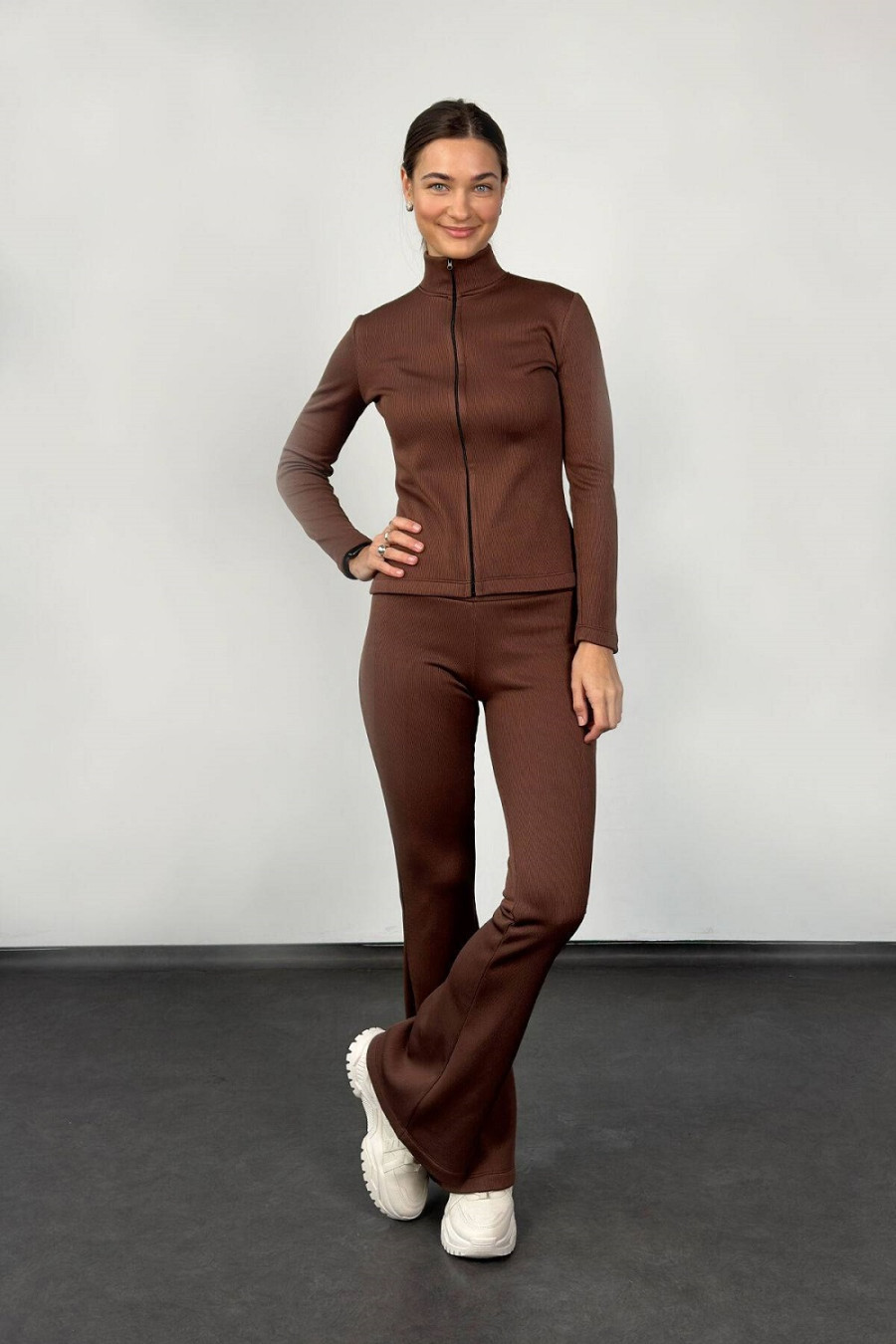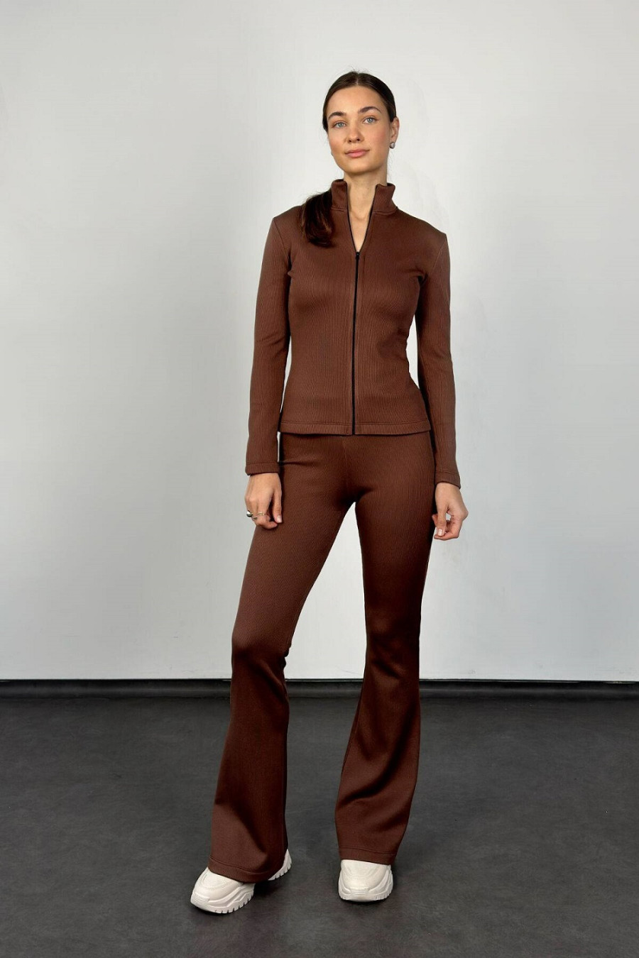 Minimalist suit "Gazelle" in brown color is an outfit that will emphasize femininity and practicality at the same time in the cold season. The top of the set is a fitted jacket with a zipper with sewn-in sleeves and a high neck. The bottom is leggings that fit well on any type of figure due to the elasticity of the fabric. This is a rib knit with faux fur insulation. Thanks to this, the suit "Gazelle" is warm, pleasant to the touch, wear-resistant, resistant to fading and dries quickly. Since the set is sewn with a minimum of details, it is appropriate to use it both as everyday wear and for walks.