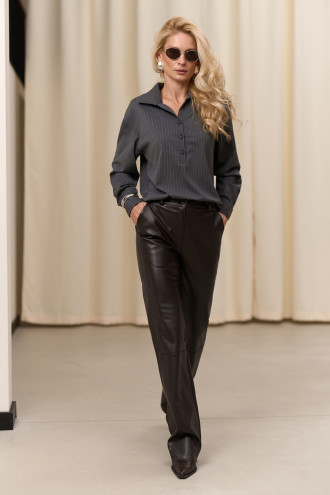 Stylish demi-season chocolate-colored eco-leather pants with suede texture on the inside. Straight-cut model, sewn-in belt, button closure and hidden zipper. Perfectly combined with shirts, sweaters or jackets to create a spectacular everyday or evening look.
